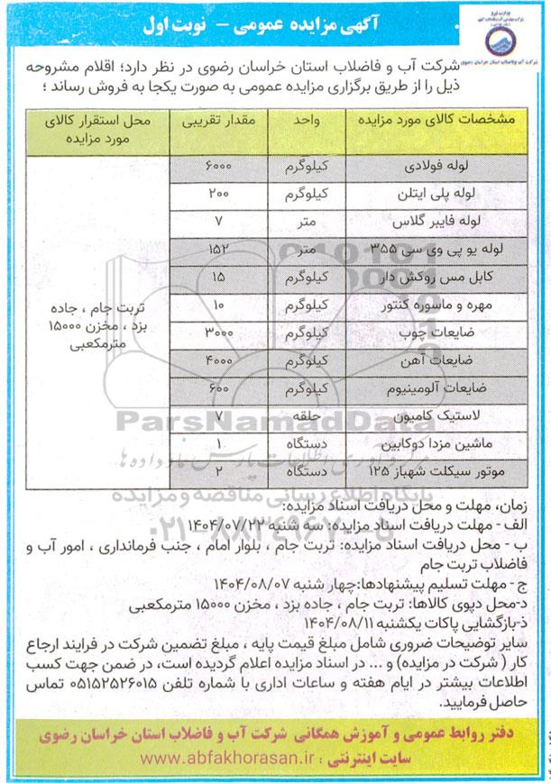 شرکت آب و فاضلاب استان خراسان رضوی در نظر دارد؛ اقلام مشروحه ذیل را از طریق برگزاری مزایده عمومی به صورت یکجا به فروش رساند ؛