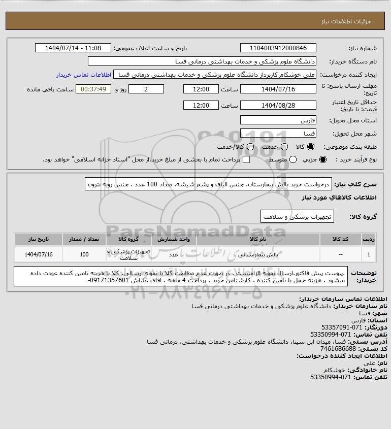 | 1 | -- | بالش بیمارستانی | عدد | تجهیزات پزشکی و سلامت | 100 | 1404/07/16 |