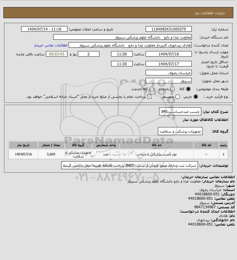 نام دستگاه خریدار:معاونت غذا و دارو دانشگاه علوم پزشکی سبزوار