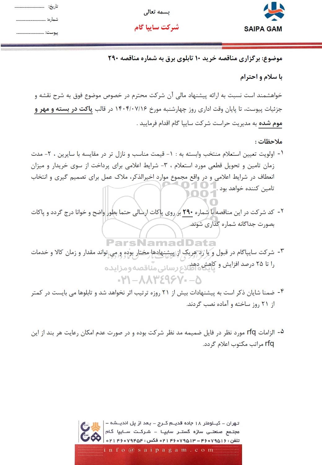 موضوع : برگزاری مناقصه خرید 10 تابلوی برق به شماره مناقصه 290