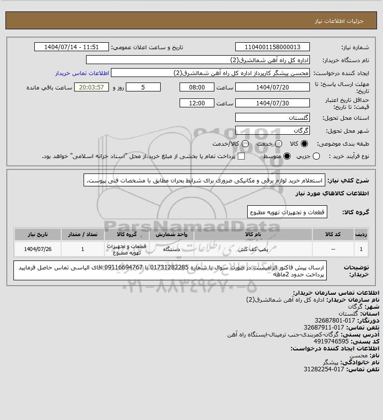 استعلام استعلام خرید لوازم برقی و مکانیکی ضروری برای شرایط بحران مطابق با مشخصات فنی پیوست., استعلام استعلام خرید لوازم برقی و مکانیکی ضروری برای شرایط بحران مطابق با مشخصات فنی پیوست.