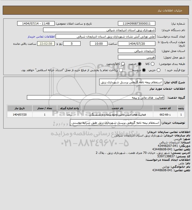 استعلام استعلام بیمه نامه گروهی پرسنل شهرداری زرنق, استعلام استعلام بیمه نامه گروهی پرسنل شهرداری زرنق