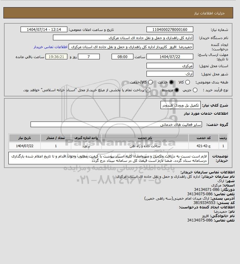 شرح کلی نیاز: تکمیل پل ورودی هندودر