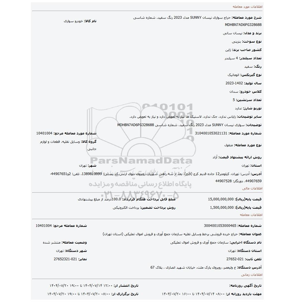 | شرح مورد معامله: حراج سواری نیسان SUNNY مدل 2023 رنگ سفید، شماره شاسی MDHBN7AD6PG328688 | نام کالا: خودرو سواری | |