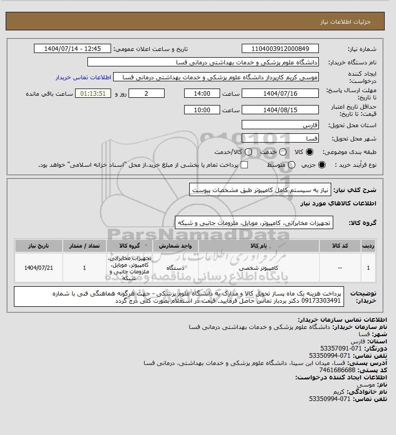 شرح کلی نیاز: نیاز به سیستم کامل کامپیوتر طبق مشخصات پیوست