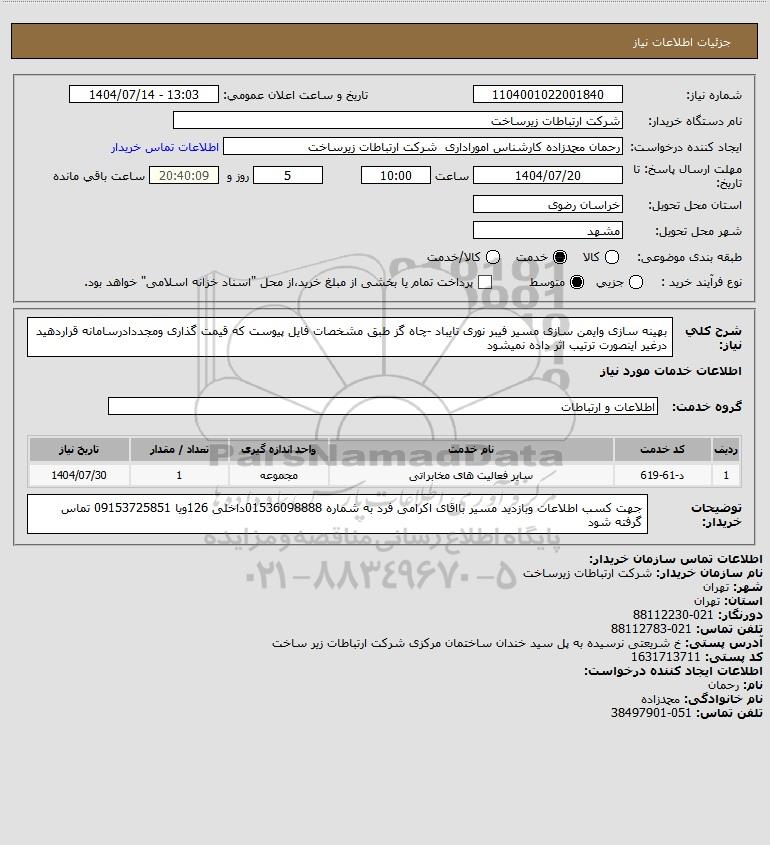 شرح کلی نیاز: بهینه سازی وایمن سازی مسیر فیبر نوری تایباد -چاه گز طبق مشخصات فایل پیوست که قیمت گذاری ومجددادرسامانه قراردهید درغیر اینصورت ترتیب اثر داده نمیشود