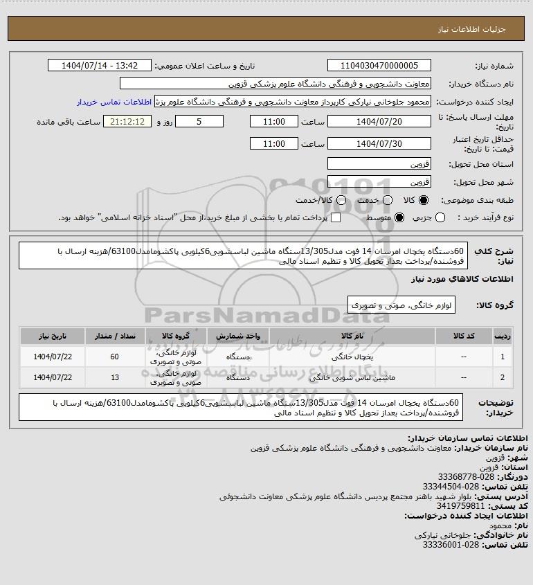 نام دستگاه خریدار:معاونت دانشجویی و فرهنگی دانشگاه علوم پزشکی قزوین