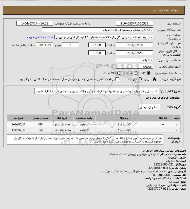 شرح کلی نیاز: شنیسل و فیله ران بدون چربی و غضروف و ضایعات.بارگرم و کشتار روز و شمالی قیمت گذاری شود.