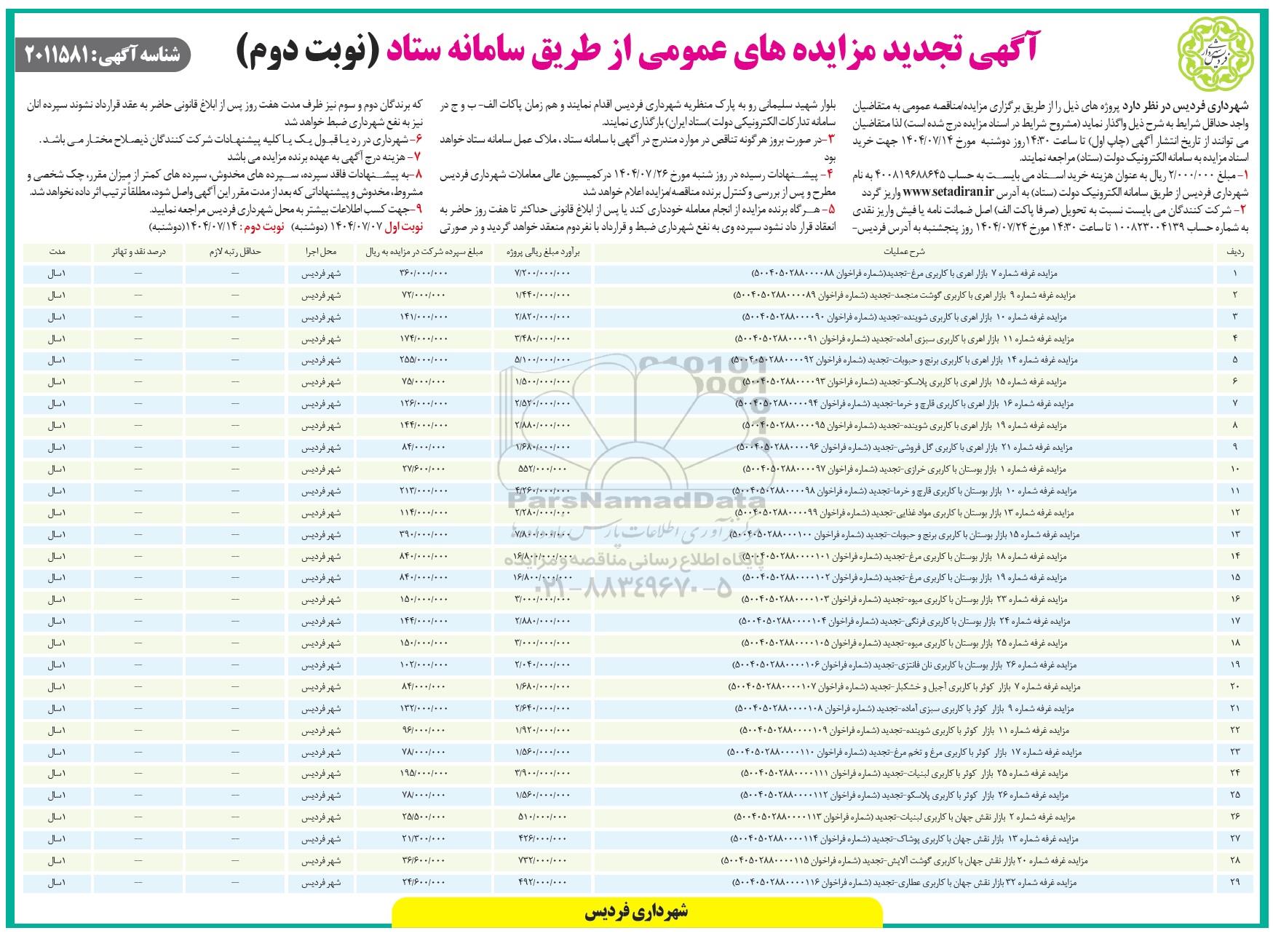28 مزایده غرفه شماره 20 بازار نقش جهان با کاربری گوشت آلایش - تجدید (شماره 5004050288000115) 732.000.000 36.600.000 شهر فردیس - - 1 سال