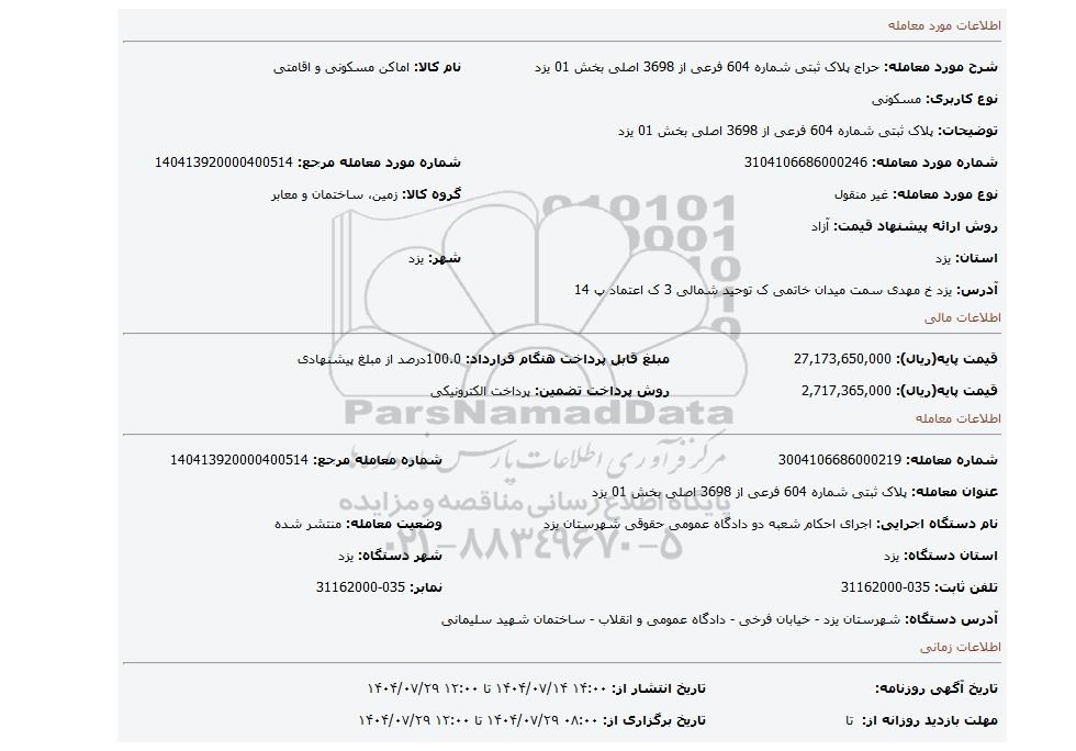 | شرح مورد معامله: حراج پلاک ثبتی شماره 604 فرعی از 3698 اصلی بخش 01 یزد | نام کالا: اماکن مسکونی و اقامتی | |
