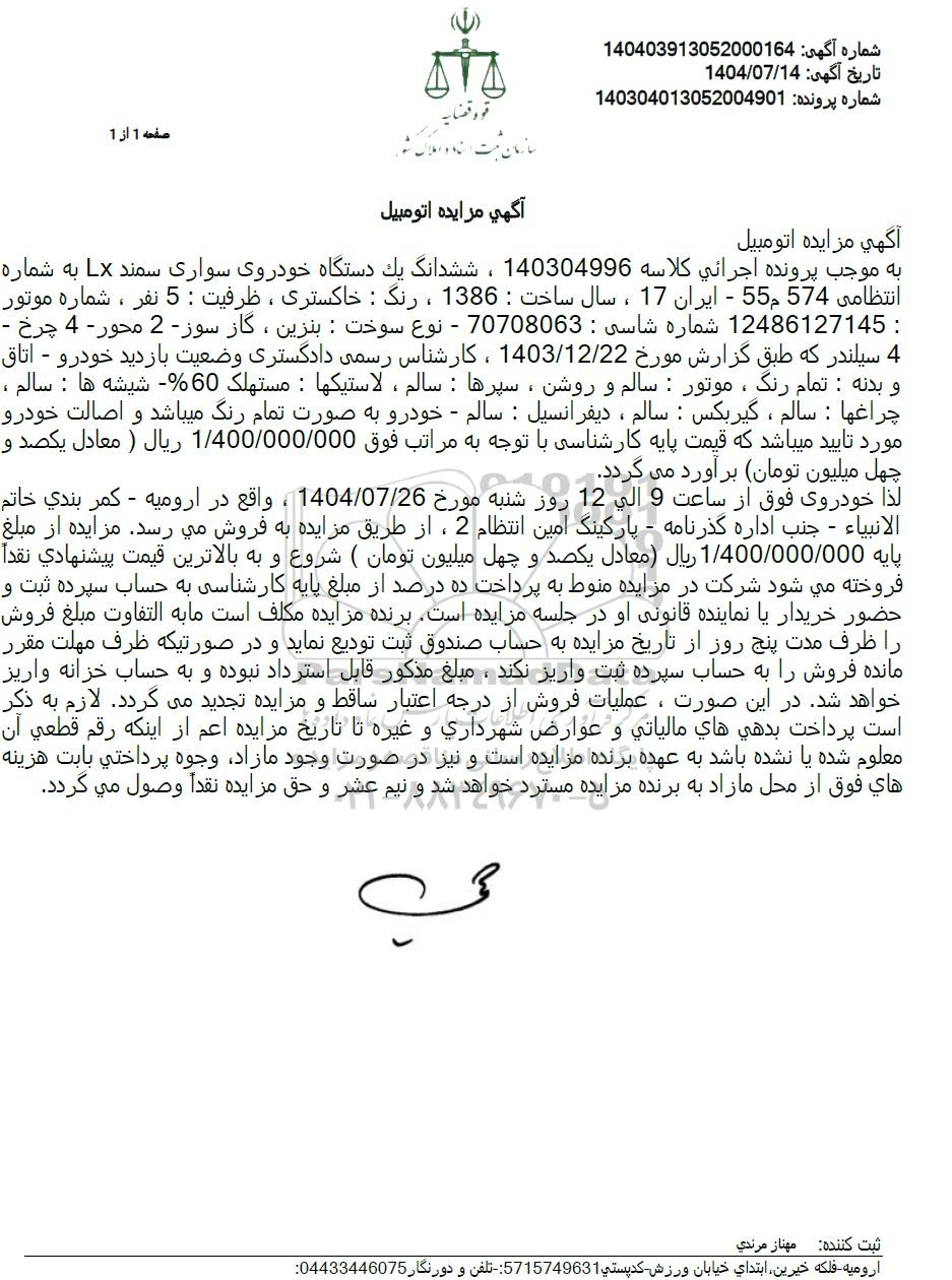 به موجب پرونده اجرائي کلاسه 140304996 ، ششدانگ یک دستگاه خودروی سواری سمند LX به شمارهانتظامی 574م 55 - ایران 17 ، سال ساخت : 1386 ، رنگ : خاکستری ، ظرفیت : 5 نفر ، شماره موتور : 12486127145 شماره شاسی : 70708063 - نوع سوخت : بنزین، گاز سوز - 2 محور - 4 چرخ -4 سیلندر که طبق گزارش مورخ 1403.12.22 ، کارشناس رسمی دادگستری وضعیت بازدید خودرو - اتاق و بدنه : تمام رنگ ، موتور : سالم و روشن ، سپرها : سالم ، لاستيكها : مستهلك 60% - شیشه ها : سالم ، چراغها : سالم ، گیربکس : سالم ، دیفرانسیل : سالم - خودرو به صورت تمام رنگ میباشد و اصالت خودرو مورد تایید میباشد که قیمت پایه کارشناسی با توجه به مراتب فوق 1.400.000.000 ریال ( معادل یکصد و چهل میلیون تومان برآورد می گردد.لذا خودروی فوق از ساعت 9 الی 12 روز شنبه مورخ 1404.07.26 ، واقع در اروميه - كمر بندي خاتم الانبياء - جنب اداره گذرنامه - پارکینگ امین انتظام 2، از طریق مزایده به فروش می رسد. مزایده از مبلغ پایه 1.400.000.000 ریال معادل یکصد و چهل میلیون تومان ( شروع و به بالاترین قیمت پیشنهادي نقداً فروخته میشود شرکت در مزایده منوط به پرداخت ده درصد از مبلغ پایه کارشناسی به حساب سپرده ثبت و حضور خریدار یا نماینده قانونی او در جلسه مزایده است. برنده مزایده مکلف است ما به التفاوت مبلغ فروش را ظرف مدت پنج روز از تاریخ مزایده به حساب صندوق ثبت تودیع نماید و در صورتیکه ظرف مهلت مقرر مانده فروش را به حساب سپرده ثبت واریز نکند، مبلغ مذکور قابل استرداد نبوده و به حساب خزانه واریز خواهد شد. در این صورت، عملیات فروش از درجه اعتبار ساقط و مزایده تجدید می گردد. لازم به ذکر است پرداخت بدهي هاي مالياتي و عوارض شهرداری و غیره تا تاریخ مزایده اعم از اینکه رقم قطعی آن معلوم شده یا نشده باشد به عهده برنده مزایده است و نیز در صورت وجود مازاد وجوه پرداختی بابت هزینه هاي فوق از محل مازاد به برنده مزایده مسترد خواهد شد و نیم عشر و حق مزایده نقداً وصول می گردد.