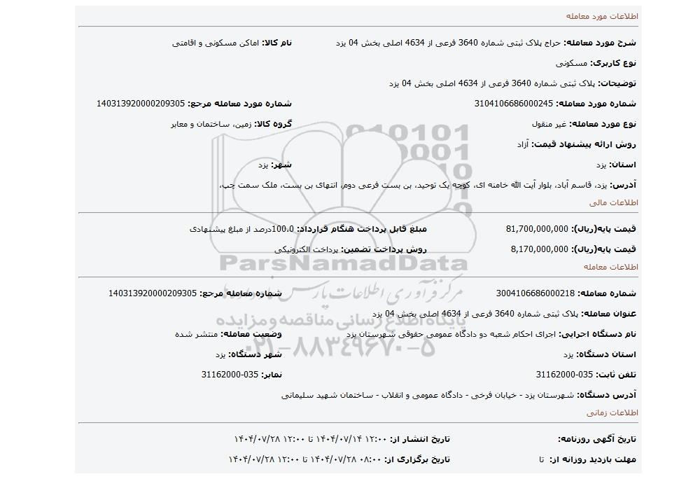 مزایده پلاک ثبتی شماره 3640 فرعی از 4634 اصلی بخش 04 یزد, مزایده، پلاک ثبتی شماره 3640 فرعی از 4634 اصلی بخش 04 یزد