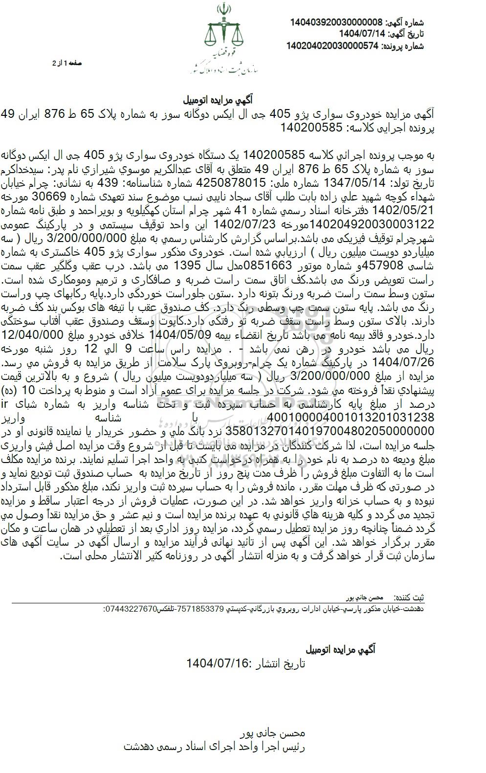 آگهی مزایده خودروی سواری پژو 405 جی ال ایکس دوگانه سوز به شماره پلاک 65 ط 876 ایران 49پرونده اجرایی کلاسه: 140200585به موجب پرونده اجرائي کلاسه 140200585 یک دستگاه خودروی سواری پژو 405 جی ال ایکس دوگانه سوز به شماره پلاک 65 ط 876 ایران 49 متعلق به آقای عبدالکریم موسوی شیرازی نام پدر: سید خداکرم تاریخ تولد: 1347.05.14 شماره ملی 4250878015 شماره شناسنامه 439 به نشانی چرام خیابان شهداء کوچه شهید علی زاده بابت طلب آقای سجاد نایبی نسب موضوع سند تعهدی شماره 30669 مورخه 1402.05.21 دفترخانه اسناد رسمی شماره 41 شهر چرام استان کهگیلویه و بویر احمد و طبق نامه شماره 140204920030003122 مورخه 1402.07.23 این واحد توقیف سیستمی و در پارکینگ عمومی شهر چرام توقیف فیزیکی می باشد. بر اساس گزارش کارشناس رسمي به مبلغ 3.200.000.000 ریال ( سه میلیارد و دویست میلیون ریال ( ارزيابي شده است. خودروی مذکور سواری پژو 405 خاکستری به شماره شاسی 457908 و شماره موتور 0851663 مدل سال 1395 می باشد درب عقب و گلگیر عقب سمت راست تعویض و رنگ می باشد. کف اتاق سمت راست ضربه و صافکاری و ترمیم و مومکاری شده است. ستون وسط سمت راست ضربه و رنگ بتونه دارد ستون جلور است خوردگی دارد. پایه رکابهای چپ وراست رنگ می باشد. پایه ستون سمت چپ وسطی رنگ دارد کف صندوق عقب با تیغه های بوکس بند کف ضربه دارند. بالای ستون وسط راست سقف ضربه تو رفتگی دارد. کاپوت وسقف وصندوق عقب آفتاب سوختگی دارد. خودرو فاقد بیمه نامه میباشد تاریخ انقضاء بیمه 1404.05.09 خلافی خودرو مبلغ 12.040.000 ریال می باشد خودرو در رهن نمی باشد مزایده راس ساعت 9 الي 12 روز شنبه مورخه 1404.07.26 در پارکینگ شماره یک چرام روبروی پارک پارک سلامت از طریق مزایده به فروش می رسد. مزایده از مبلغ 3.200.000.000 ريال ) سه میلیارد و دویست میلیون ریال ) شروع و به بالاترین قیمت پیشنهادي نقداً فروخته می شود شرکت در جلسه مزایده برای عموم آزاد است و منوط به پرداخت 10 (ده) درصد از مبلغ پایه کارشناسی به حساب سپرده ثبت و تحت شناسه واریز به شماره شبای ir400100004001013201031238  با شناسه واریز358013270140197004802050000000  نزد بانک ملی و حضور خریدار یا نماینده قانونی او درواریزشناسهجلسه مزایده است لذا شرکت کنندگان در مزایده می بایست تا قبل از شروع وقت مزایده اصل فیش واریزی مبلغ ودیعه ده درصد به نام خود را به همراه درخواست کتبی به واحد اجرا تسلیم نمایند. برنده مزایده مکلف است ما به التفاوت مبلغ فروش را ظرف مدت پنج روز از تاریخ مزایده به حساب صندوق ثبت تودیع نماید و در صورتی که ظرف مهلت مقرر مانده فروش را به حساب سپرده ثبت واریز نکند مبلغ مذکور قابل استرداد نبوده و به حساب خزانه واریز خواهد شد. در این صورت عملیات فروش از درجه اعتبار ساقط و مزایده تجدید می گردد و کلیه هزینه های قانونی به عهده برنده مزایده است و نیم عشر و حق مزايده نقداً وصول مي گردد ضمنا چنانچه روز مزایده تعطیل رسمی گردد مزایده روز اداری بعد از تعطیلی در همان ساعت و مکان مقرر برگزار خواهد شد. این آگهی پس از تائید نهایی فرآیند مزایده و ارسال آگهی در سایت آگهی های سازمان ثبت قرار خواهد گرفت و به منزله انتشار آگهی در روزنامه کثیر الانتشار محلی است.