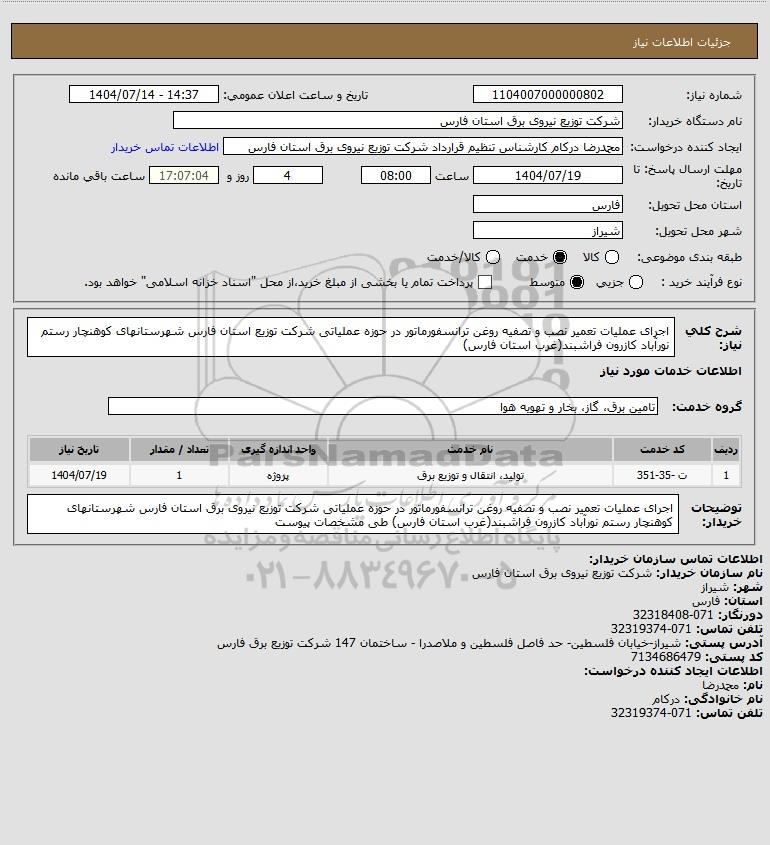 شرح کلی نیاز: اجرای عملیات تعمیر نصب و تصفیه روغن ترانسفورماتور در حوزه عملیاتی شرکت توزیع استان فارس شهرستانهای کوهنچار رستم نورآباد کازرون فراشبند(غرب استان فارس)