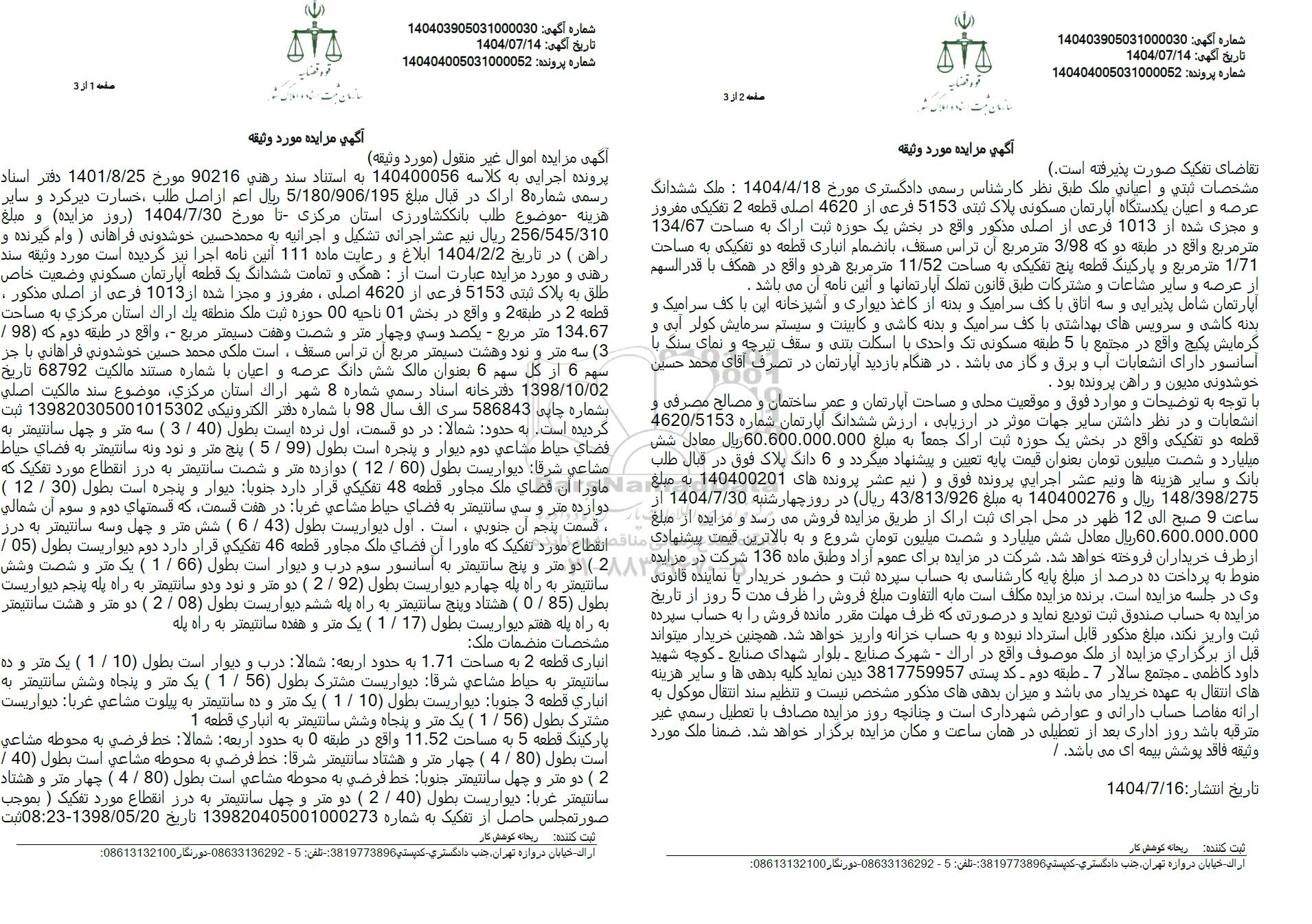 مزایده تمامت ششدانگ یک قطعه آپارتمان مسكونی وضعيت خاص طلق به پلاک ثبتی 5153 فرعی از 4620 اصلی, مزایده تمامت ششدانگ یک قطعه آپارتمان مسكونی وضعيت خاص طلق به پلاک ثبتی 5153 فرعی از 4620 اصلی