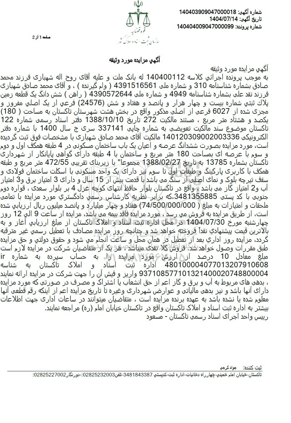 به موجب پرونده اجرائی کلاسه 140400112 له بانک ملت و علیه آقای روح اله شهبازی فرزند محمد صادق بشماره شناسنامه 310 و شماره ملی 4391516561 ) وام گیرنده ) ، و آقای محمد صادق شهبازی فرزند نقد علی بشماره شناسنامه 4949 و شماره ملی 4390572644 ) راهن ) شش دانگ یک قطعه زمین یلاك ثبتی شماره بیست و چهار هزار و پانصد و هفتاد و شش (24576) فرعی از یک اصلی مفروز و مجری شده از 6027 فرعی از اصلی مذکور واقع در بخش هشت شهرستان تاکستان به مساحت ( 180) یکصد و هشتاد متر مربع ، مستند مالکیت 272 تاریخ 1388/10/10 دفتر اسناد رسمی شماره 122 تاکستان موضوع سند مالکیت تعویضی به شماره چاپی 337141 سری ج سال 1400 با شماره دفتر الكترونیكی 140120309002003336 مالکیت آقای محمد صادق شهبازی با مشخصات فوق ثبت گردیده است مورد مزایده بصورت ششدانگ عرصه و اعیان یک باب ساختمان مسکونی در 4 طبقه همکف اول و دوم و سوم با عرصه ای بمساحت 180 متر مربع و ساختمان با 4 طبقه دارای گواهی پایانکار از شهرداری تاکستان بشماره 13785 به تاریخ 1388/02/27 مجموعا با زیربنای تقریبی 472/55 متر مربع و طبقه همکف با کاربری پارکینگ و طبقات اول تا سوم نیز دارای یک واحد مسکونی با اسکلت ساختمان فولادی و سقف تیرچه بلوک و نمای اصلی از سنگ میباشد با قدمت بیش از 15 سال و دارای 3 امتیاز برق و 3 امتیاز آب و 2 امتیاز گاز میباشد ، واقع در تاکستان بلوار حافظ انتهای کوچه غزل 4 بر بلوار سعدی ، قواره دوم جنوبی با 3481355885 که برابر نظریه کارشناس رسمی دادگستری مورد مزایده با تمامی ملحقات و امتیازات به مبلغ ( 74/500/000/000 هفتاد و چهار میلیارد و پانصد میلیون ریال ارزیابی شده است از طریق مزایده به فروش می رسد، مورد مزایده فاقد بیمه میباشد مزایده از ساعت 9 الی 12 روز چهارشنبه مورخ 1404.07.30 در محل اداره ثبت اسناد و املاک تاکستان از مبلغ ارزیابی آغاز و به بالاترین قیمت پیشنهادی نقداً فروخته خواهد شد و چنانچه روز مزایده مصادف با تعطیل رسمی غیر مترقبه گردد مزایده روز اداری بعد از تعطیل در همان محل و ساعت انجام میشود و حقوق دولتی و حق مزایده طبق مقررات وصول خواهد شد فروش کلا نقدی میباشد ، هر یک از متقاضیان شرکت در مزایده لازم است. مبلغ معادل 10 درصد از ارزش مورد مزایده را به حساب سپرده به شماره ir املاک تاکستان به شناسه 937108577101321400020748800004 واریز و فیش آن را جهت شرکت در مزایده ارائه نمایند ، بدهی های مربوط به آب و برق و گاز اعم از حق انشعاب یا اشتراک و مصرف در صورتی که مورد مزایده دارای آنها باشد و نیز بدهی مالیاتی و عوارض شهرداری و غیره تا تاریخ مزایده اعم از اینکه رقم قطعی آنها معلوم شده یا نشده باشد به عهده برنده مزایده است، متقاضیان میتوانند در ساعات اداری جهت اطلاعات 481355885 با کد پستی 480100004077013207910608 اداره ثبت اسناد و بیشتر به اداره ثبت اسناد و املاک تاکستان واقع در تاکستان خیابان امام (ره) مراجعه نمایند.