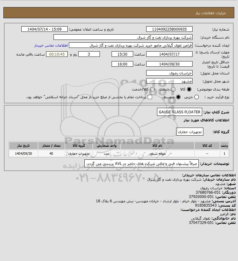 شرح کلی نیاز: GAUGE GLASS FLOATER