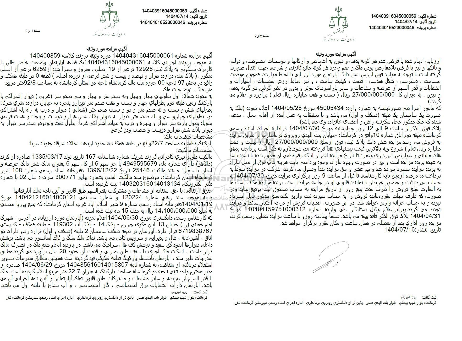 آگهی مزایده شماره 140404316045000061 مورد وثیقه پرونده کلاسه 140400859 به موجب پرونده اجرائی كلاسه 140404316045000061 یک قطعه آپارتمان وضعیت خاص طلق با کاربری مسکونی به پلاک ثبتی 12926 فرعی از 19 اصلی ، مفروز و مجزا شده از 6259 فرعی از اصلی مذكور ، پلاک ثبتی دوازده هزار و نهصد و بیست و شش فرعی از نوزده اصلی ( قطعه 0 در طبقه همکف و واقع در بخش 97 ناحیه 00 حوزه ثبت ملک كرمانشاه ناحیه دو استان کرمانشاه به مساحت 92/8 متر مربع. متن ملک ، توضیحات ملک
