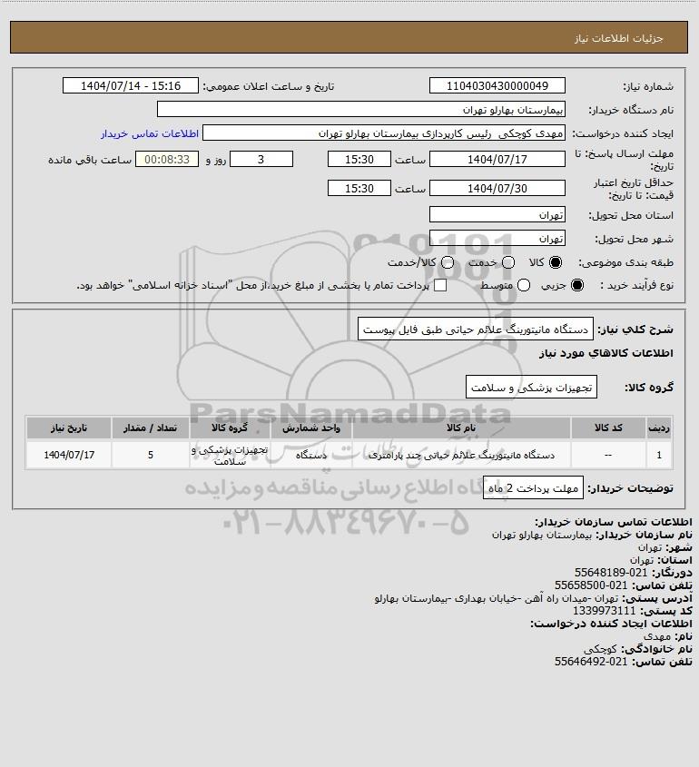 | 1 | -- | دستگاه مانیتورینگ علائم حیاتی چند پارامتری | دستگاه | تجهیزات پزشکی و سلامت | 5 | 1404/07/17 |