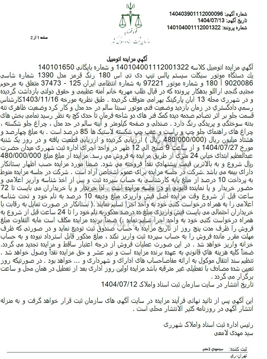 آگهی مزایده اتومبیل کلاسه 140104001112001322 و شماره بایگانی 140101650