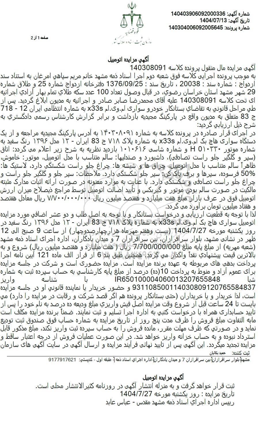 لذا با توجه به قطعیت ارزیابی و درخواست بستانکار و با توجه به اصل طلب و دو عشر اضافي مورد مزایده اتومبیل سواری هاچ یک ام وی ام x33 به شماره پلاک 718 ج 83 ایران - 12 مدل 1396 رنگ سفید در روز یکشنبه مورخه 1404.7.27 بیست و هفتم مهرماه هزار چهار صد و چهار از ساعت 9 صبح الی 12 ظهر در نشانی مشهد بلوار سرافرازان بین سرافرازان 7 و میدان ،یادگاران اداره اجرای اسناد ذمه مشهد شعبه مهریه از مبلغ پایه مبلغ 7.700.000.000 ریال ) هفت میلیارد و هفتصد میلیون ریال شروع و به بالاترین قیمت پیشنهادي نقدا واگذار می گردد. همچنین طبق بند 6 از فراز الف ماده 121 آیین نامه اجرا پرداخت بدهی های مربوطه به عهده برنده مزایده است. مزایده حضوری است و شرکت در جلسه مزایده برای عموم آزاد و منوط به پرداخت (10 ده درصد از مبلغ پایه کارشناسی به حساب سپرده ثبت به شماره با شبا IR650100004060013207655848 شناسه واریز 931108500114030809120765584837 و حضور خریدار یا نماینده قانونی او در جلسه مزایده است، لذا خریدار و یا خریداران حتی بستانکار پرونده هم اگر قصد شرکت و رقابت در مزایده را دارد می بایست تا 24 ساعت قبل از شروع وقت مزایده اصل فیش واريزي مبلغ ودیعه ده درصد به نام خود را پس از تایید حسابداری همراه با درخواست کتبی به اداره اجرا تسلیم و ثبت نمایند ضمناً برنده مزایده مکلف است ما به التفاوت مبلغ فروش را ظرف مدت پنج روز از تاریخ مزایده به شماره حساب فوق صندوق ثبت توديع نماید و در صورتی که ظرف مهلت مقرر مانده فروش را به حساب سپرده ثبت واریز نکند، مبلغ مذکور قابل استرداد نبوده و به حساب خزانه واریز خواهد شد. در این صورت عملیات فروش از درجه اعتبار ساقط و مزایده تجدید میگردد. این آگهی پس از تایید نهایی فرآیند مزایده و ارسال آگهی در سایت سایت آگهی های سازمان