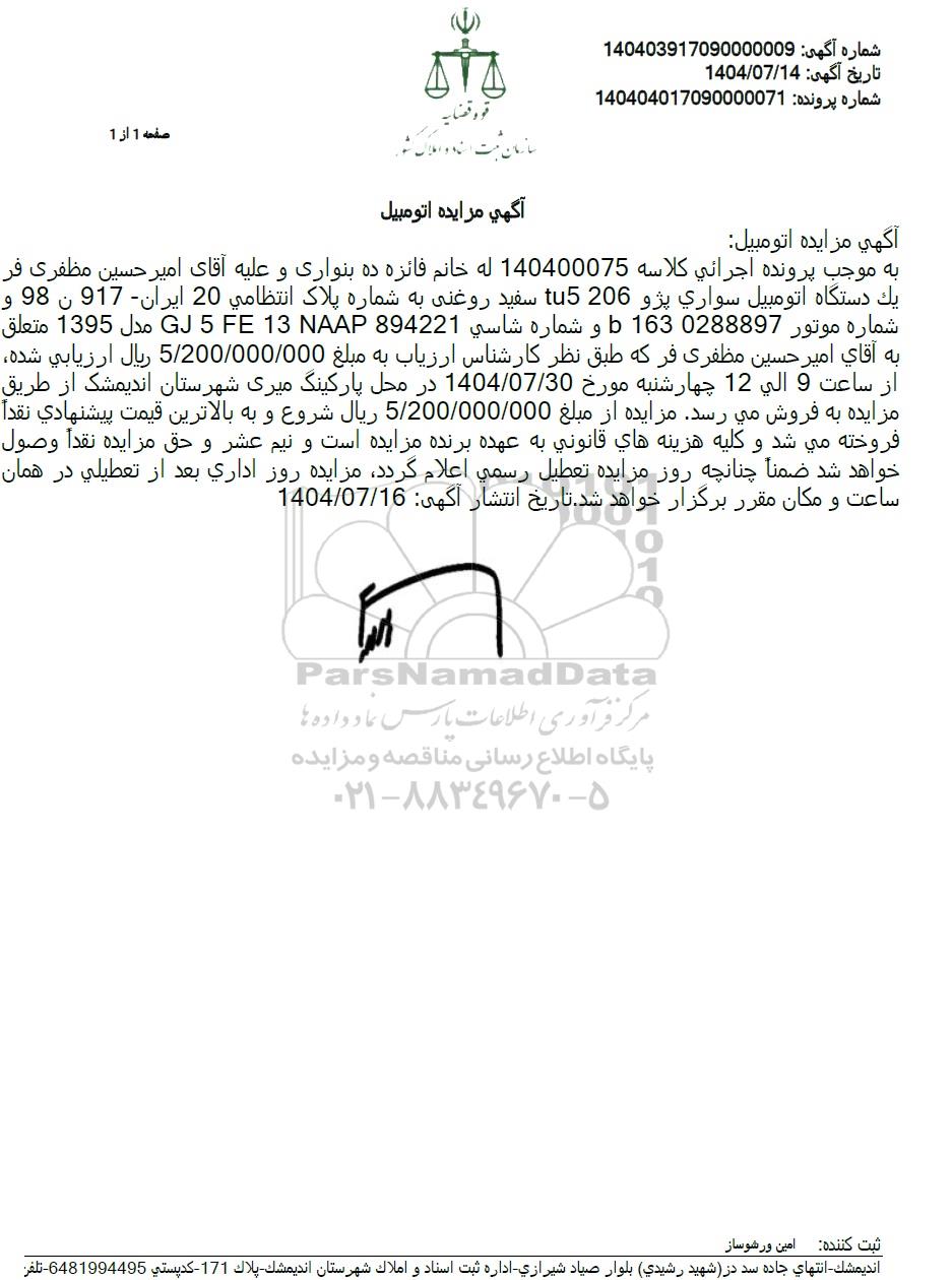 به موجب پرونده اجرائی كلاسه 140400075 له خانم فائزه ده بنواری و علیه آقای امیر حسین مظفری فر يک دستگاه اتومبیل سواری پژو 206 tu5 سفید روغنی به شماره پلاک انتظامی 20 ایران 917 ن 98 و مدل 1395 متعلق GJ5FE 13 NAAP 894221 شماره موتور 1630288897 و شماره شاسي به آقای امیر حسین مظفری فر که طبق نظر کارشناس ارزیاب به مبلغ 5.200.000.000 ریال ارزيابی شده از ساعت 9 الی 12 چهارشنبه مورخ 1404.07.30 در محل پارکینگ میری شهرستان اندیمشک از طریق مزایده به فروش می رسد. مزایده از مبلغ 5.200.000.000 ريال شروع و به بالاترین قیمت پیشنهادی نقداً فروخته می شد و کلیه هزينه های قانونی به عهده برنده مزایده است و نیم عشر و حق مزايده نقداً وصول خواهد شد ضمنا چنانچه روز مزایده تعطیل رسمی اعلام گردد مزایده روز اداری بعد از تعطیلی در همان ساعت و مکان مقرر برگزار خواهد شد. تاریخ انتشار آگهی: 1404.07.16
