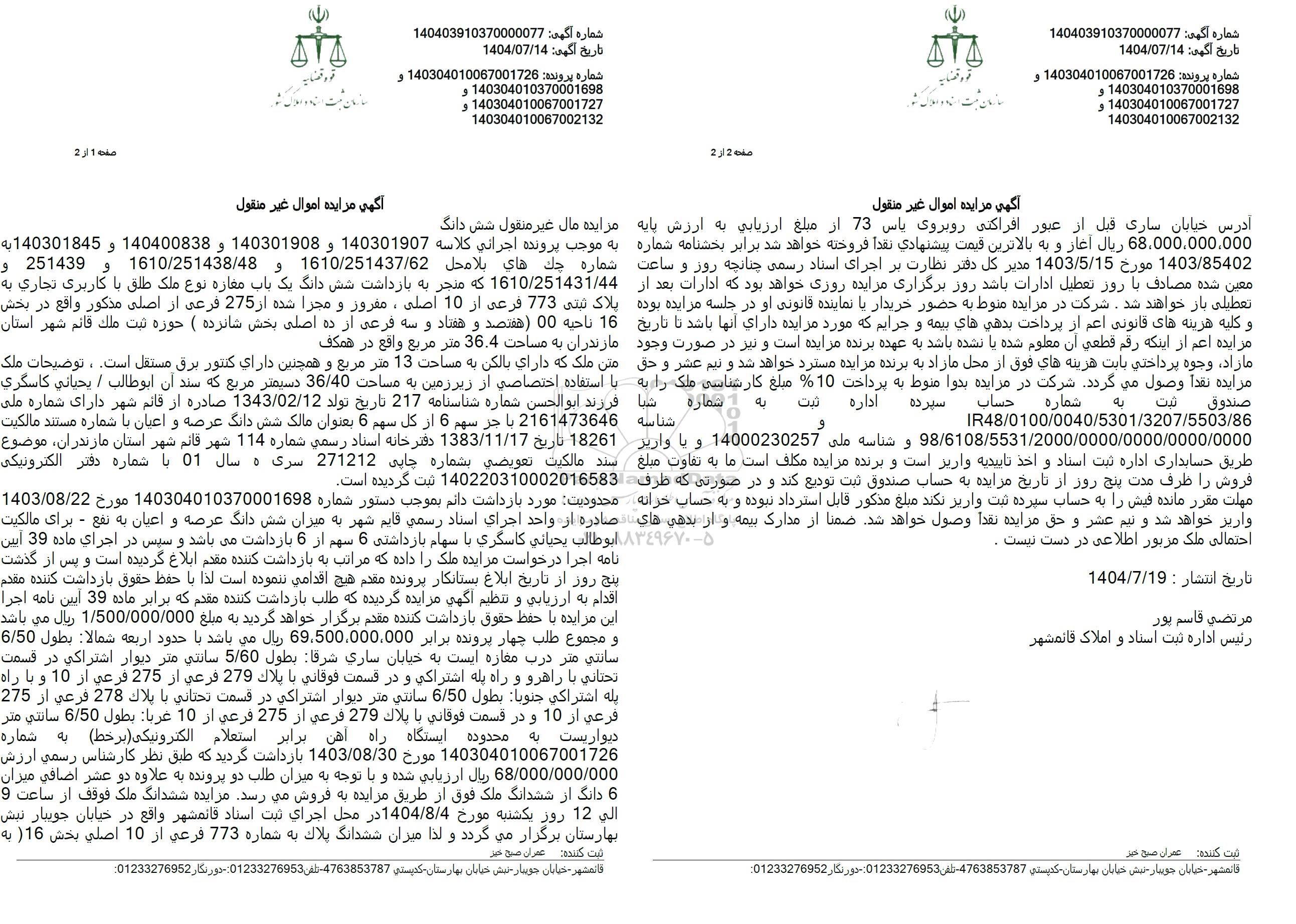 1403.08.22 محدودیت مورد بازداشت دائم بموجب دستور شماره 140304010370001698 مورخ صادره از واحد اجرای اسناد رسمی قایم شهر به میزان شش دانگ عرصه و اعیان به نفع - برای مالکیت ابو طالب يحيائي كاسكري با سهام بازداشتی 6 سهم از 6 بازداشت می باشد و سپس در اجرای ماده 39 آبین نامه اجرا درخواست مزایده ملک را داده که مراتب به بازداشت کننده مقدم ابلاغ گردیده است و پس از گذشت پنج روز از تاریخ ابلاغ بستانکار پرونده مقدم هیچ اقدامی ننموده است لذا با حفظ حقوق بازداشت کننده مقدم اقدام به ارزیابی و تنظیم آگهی مزایده گردیده که طلب بازداشت کننده مقدم که برابر ماده 39 آیین نامه اجرا این مزایده با حفظ حقوق بازداشت کننده مقدم برگزار خواهد گردید به مبلغ 1.500.000.000 ريال مي باشد و مجموع طلب چهار پرونده برابر 69،500،000،000 ريال مي باشد با حدود اربعه شمالا : بطول 6/50 سانتي متر درب مغازه ایست به خیابان ساري شرقا : بطول 5/60 سانتي متر دیوار اشتراکی در قسمت تحتانی با راهرو و راه پله اشتراکی و در قسمت فوقانی با پلاک 279 فرعي از 275 فرعی از 10 و با راه پله اشتراكي جنوبا بطول 6/50 سانتي متر ديوار اشتراکی در قسمت تحتانی با پلاك 278 فرعي از 275 فرعي از 10 و در قسمت فوقانی با پلاک 279 فرعي از 275 فرعي از 10 غربا بطول 6/50 سانتي متر دیواریست به محدوده ایستگاه راه آهن برابر استعلام الکترونیکی (برخط) به شماره 140304010067001726 مورخ 1403.08.30 بازداشت گردید که طبق نظر کارشناس رسمی ارزش 68.000.000.000 ریال ارزیابی شده و با توجه به میزان طلب دو پرونده به علاوه دو عشر اضافي ميزان 6 دانگ از ششدانگ ملک فوق از طریق مزایده به فروش میرسد. مزایده ششدانگ ملک فوقف از ساعت 9 الي 12 روز یکشنبه مورخ 1404.8.4 در محل اجراي ثبت اسناد قائم شهر واقع در خیابان جویبار نبش بهارستان برگزار میگردد و لذا میزان ششدانگ پلاک به شماره 773 فرعي از 10 اصلي بخش 16 ) به آدرس خیابان ساری قبل از عبور افراکنی روبروی پاس 73 از مبلغ ارزیابی به ارزش پایه 68،000،000،000 ریال آغاز و به بالاترین قیمت پیشنهادی نقدا فروخته خواهد شد برابر بخشنامه شماره 1403.85402 مورخ 1403.5.15 مدیر کل دفتر نظارت بر اجرای اسناد رسمی چنانچه روز و ساعت معین شده مصادف با روز تعطیل ادارات باشد روز برگزاری مزایده روزی خواهد بود که ادارات بعد از تعطیلی باز خواهند شد. شرکت در مزایده منوط به حضور خریدار یا نماینده قانونی او در جلسه مزایده بوده و کلیه هزینه های قانونی اعم از پرداخت بدهي هاي بيمه و جرایم که مورد مزایده داراي آنها باشد تا تاریخ مزایده اعم از اینکه رقم قطعی آن معلوم شده یا نشده باشد به عهده برنده مزایده است و نیز در صورت وجود مازاد، وجوه پرداختی بابت هزینه های فوق از محل مازاد به برنده مزایده مسترد خواهد شد و نیم عشر و حق مزایده نقداً وصول ميگردد شرکت در مزایده بدوا منوط به پرداخت 10% مبلغ کارشناسی ملک را به صندوق ثبت به شماره حساب سپرده اداره ثبت به شماره شبا IR48.0100.0040.5301.3207.5503.86 و شناسه 98.6108.5531.2000.0000.0000.0000.0000 و شناسه ملی 14000230257 و یا واریز و طریق حسابداری اداره ثبت اسناد و اخذ تاییدیه واریز است و برنده مزایده مکلف است ما به تفاوت مبلغ فروش را ظرف مدت پنج روز از تاریخ مزایده به حساب صندوق ثبت تودیع کند و در صورتی که ظرف مهلت مقرر مانده فیش را به حساب سپرده ثبت واریز نکند مبلغ مذکور قابل استرداد نبوده و به حساب خزانه واریز خواهد شد و نیم عشر و حق مزایده نقداً وصول خواهد شد. ضمنا از مدارک بیمه و از بدهي هاي احتمالی ملک مزبور اطلاعی در دست نیست .