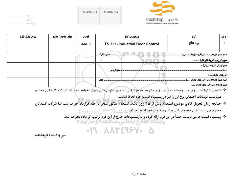 | 1 | برد gfa | TS971-INDUSTRIAL DOOR CONTROL | 1 عدد |