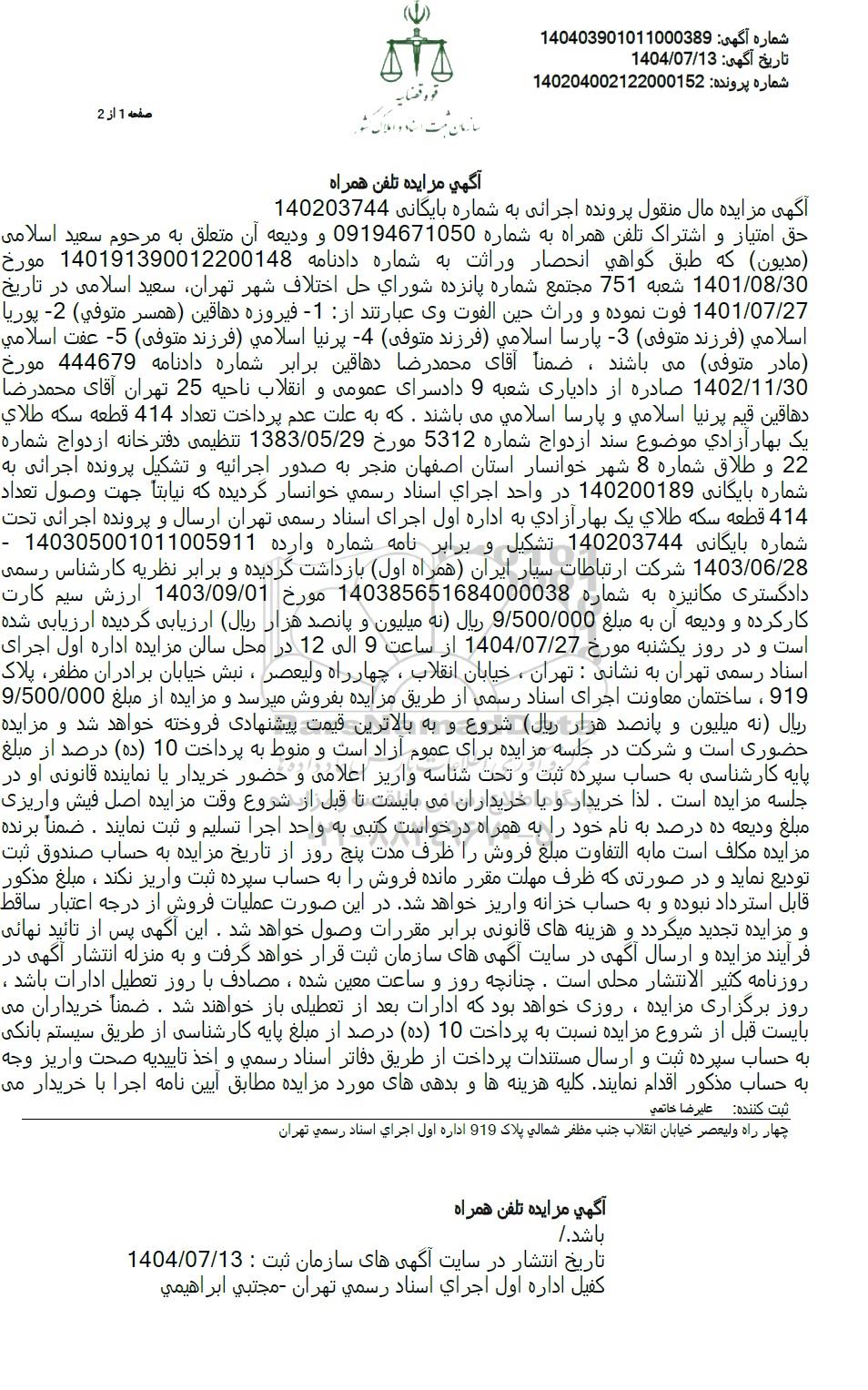 حق امتیاز و اشتراک تلفن همراه به شماره 09194671050 و ودیعه آن متعلق به مرحوم سعید اسلامی (مدیون) که طبق گواهی انحصار وراثت به شماره دادنامه 140191390012200148 مورخ 1401.8.30 شعبه 751 مجتمع شماره پانزده شوراي حل اختلاف شهر تهران سعید اسلامی در تاریخ 1401.07.27 فوت نموده و وراث حين الفوت وی عبارتند از: 1- فیروزه دهاقین (همسر متوفی) 2- پوریا اسلامی (فرزند متوفی) 3- پارسا اسلامی (فرزند متوفی) 4- پرنیا اسلامی (فرزند متوفی) 5- عفت اسلامي (مادر متوفی) می باشند، ضمنا آقای محمدرضا دهاقین برابر شماره دادنامه 444679 مورخ 1402.11.30 صادره از دادیاری شعبه 9 دادسرای عمومی و انقلاب ناحیه 25 تهران آقای محمدرضا دهاقین قیم پرنیا اسلامی و پارسا اسلامی میباشند. که به علت عدم پرداخت تعداد 414 قطعه سكه طلاي یک بهار آزادی موضوع سند ازدواج شماره 5312 مورخ 1383.05.29 تنظیمی دفترخانه ازدواج شماره 22 و طلاق شماره 8 شهر خوانسار استان اصفهان منجر به صدور اجرائیه و تشکیل پرونده اجرائی به شماره بایگانی 140200189 در واحد اجراي اسناد رسمي خوانسار گردیده که نیابتاً جهت وصول تعداد 414 قطعه سکه طلای یک بهار آزادی به اداره اول اجرای اسناد رسمی تهران ارسال و پرونده اجرائی تحت - 140305001011005911 شماره بایگانی 140203744 تشکیل و برابر نامه شماره وارده دادگستری مکانیزه به شماره 140385651684000038 مورخ 1403.09.01 ارزش سیم کارت 1403/06/28 شرکت ارتباطات سیار ایران همراه اول بازداشت گردیده و برابر نظریه کارشناس رسمی کار کرده و ودیعه آن به مبلغ 9.500.000 ريال (نه میلیون و پانصد هزار ریال) ارزیابی گردیده ارزیابی شده است و در روز یکشنبه مورخ 1404.07.27 از ساعت 9 الی 12 در محل سالن مزایده اداره اول اجرای اسناد رسمی تهران به نشانی: تهران، خیابان انقلاب ، چهار راه ولیعصر ، نبش خیابان برادران مظفر پلاک 919 ، ساختمان معاونت اجرای اسناد رسمی از طریق مزایده بفروش میرسد و مزایده از مبلغ 9.500.000 ريال نه میلیون و پانصد هزار ریال شروع و به بالاترین قیمت پیشنهادی فروخته خواهد شد و مزایده حضوری است و شرکت در جلسه مزایده برای عموم آزاد است و منوط به پرداخت 10 (ده) درصد از مبلغ پایه کارشناسی به حساب سپرده ثبت و تحت شناسه واریز اعلامی و حضور خریدار یا نماینده قانونی او در جلسه مزایده است . لذا خریدار و یا خریداران می بایست تا قبل از شروع وقت مزایده اصل فیش واریزی مبلغ ودیعه ده درصد به نام خود را به همراه درخواست کتبی به واحد اجرا تسلیم و ثبت نمایند . ضمناً برنده مزایده مکلف است ما به التفاوت مبلغ فروش را ظرف مدت پنج روز از تاریخ مزایده به حساب صندوق ثبت تودیع نماید و در صورتی که ظرف مهلت مقرر مانده فروش را به حساب سپرده ثبت واریز نکند ، مبلغ مذکور قابل استرداد نبوده و به حساب خزانه واریز خواهد شد. در این صورت عملیات فروش از درجه اعتبار ساقط و مزایده تجدید میگردد و هزینه های قانونی برابر مقررات وصول خواهد شد. این آگهی پس از تایید نهانی فرآیند مزایده و ارسال آگهی در سایت آگهی های سازمان ثبت قرار خواهد گرفت و به منزله انتشار آگهی در روزنامه کثیر الانتشار محلی است. چنانچه روز و ساعت معین شده ، مصادف با روز تعطیل ادارات باشد . روز برگزاری مزایده ، روزی خواهد بود که ادارات بعد از تعطیلی باز خواهند شد . ضمناً خریداران می بایست قبل از شروع مزایده نسبت به پرداخت 10 (ده) درصد از مبلغ پایه کارشناسی از طریق سیستم بانکی به حساب سپرده ثبت و ارسال مستندات پرداخت از طریق دفاتر اسناد رسمي و اخذ تاییدیه صحت واریز وجه به حساب مذکور اقدام نمایند. کلیه هزینه ها و بدهیهای مورد مزایده مطابق آیین نامه اجرا با خریدار می