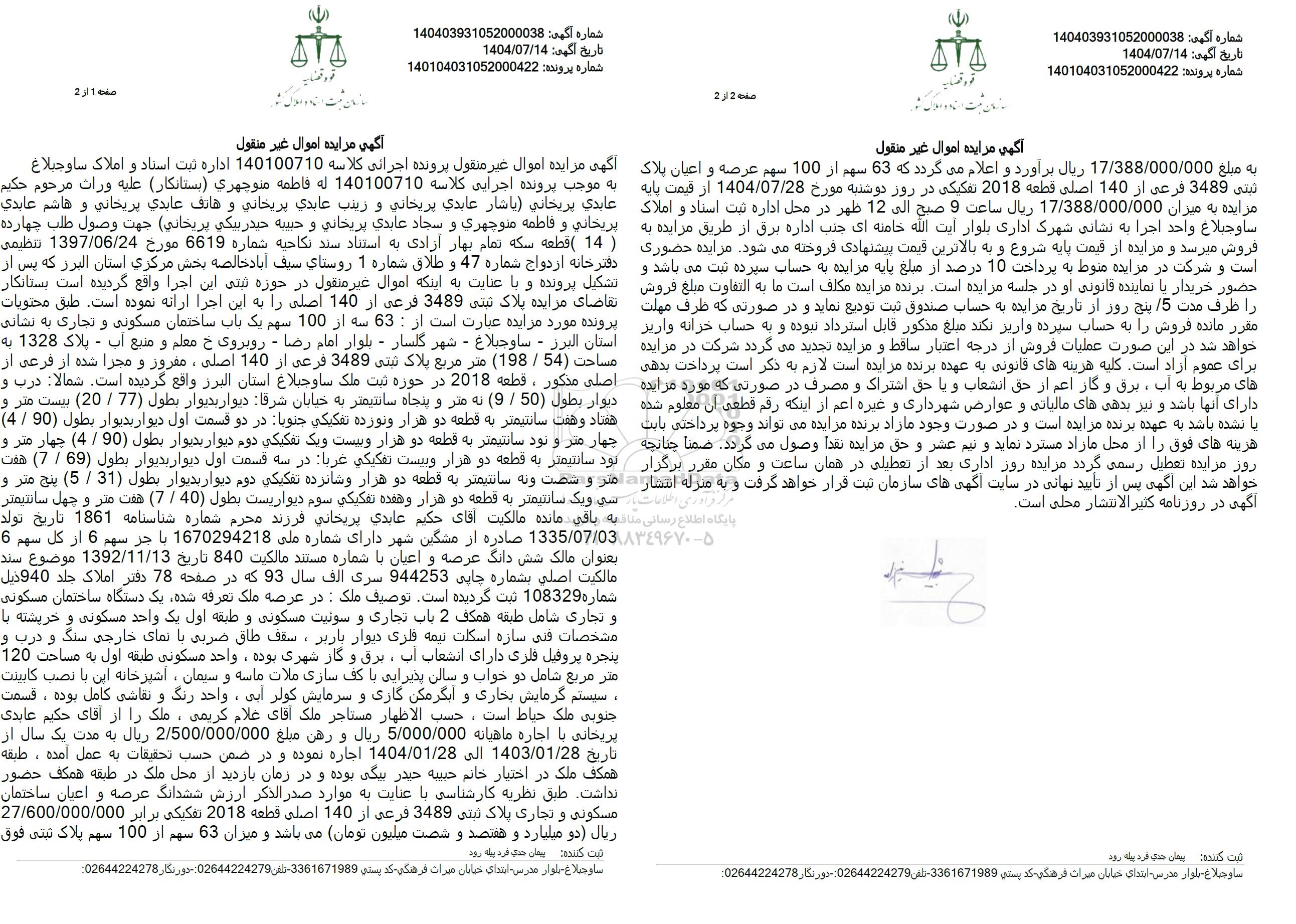آگهی مزایده اموال غیر منقول پرونده اجرائی کلاسه 140100710 اداره ثبت اسناد و املاک ساوجبلاغ به موجب پرونده اجرایی کلاسه 140100710 له فاطمه منوچهری (بستانکار) عليه وراث مرحوم حكيم عابدي پريخاني ياشار عابدي پريخاني و زينب عابدي پريخاني و هاتف عابدي پريخاني و هاشم عابدي پریخانی و فاطمه منوچهری و سجاد عابدي پريخاني و حبيبه حيدر بيكي پريخاني جهت وصول طلب چهارده ( 14 ) قطعه سکه تمام بهار آزادی به استناد سند نکاحیه شماره 6619 مورخ 1397/06/24 تنظيمي دفتر خانه ازدواج شماره 47 و طلاق شماره 1 روستاي سيف آباد خالصه بخش مرکزی استان البرز که پس از تشکیل پرونده و با عنایت به اینکه اموال غیر منقول در حوزه ثبتی این اجرا واقع گردیده است بستانکار تقاضای مزایده پلاک ثبتی 34894 فرعی از 140 اصلی را به این اجرا ارائه نموده است. طبق محتویات پرونده مورد مزایده عبارت است از : 63 سه از 100 سهم یک باب ساختمان مسکونی و تجاری به نشانی استان البرز - ساوجبلاغ - شهر گلسار - بلوار امام رضا - روبروی خ معلم و منبع آب - پلاک 1328 به مساحت (54) / (198) متر مربع پلاک ثبتی 3489 فرعی از 140 اصلی ، مفروز و مجزا شده از فرعی از اصلی مذکور ، قطعه 2018 در حوزه ثبت ملک ساوجبلاغ استان البرز واقع گردیده است. شمالا درب و دیوار بطول (50) / (9) نه متر و پنجاه سانتیمتر به خیابان شرقا ديوار بديوار بطول 77 / 20 بیست متر و هفتاد و هفت سانتیمتر به قطعه دو هزار و نوزده تفکیکی جنوبا در دو قسمت اول دیوار بدیوار بطول (90 / 4) چهار متر و نود سانتیمتر به قطعه دو هزار و بیست و یک تفکيکي دوم دیوار بديوار بطول 90 / 4) چهار متر و نود سانتیمتر به قطعه دو هزار و بيست تفكيكي غربا در سه قسمت اول دیوار بدیوار بطول (69 / 7) هفت متر و شصت و نه سانتیمتر به قطعه دو هزار و شانزده تفکيکي دوم ديوار بديوار بطول 31 / 5) پنج متر و سی و یک سانتیمتر به قطعه دو هزار و هفده تفكيكي سوم ديواريست بطول (40) / (7) هفت متر و چهل سانتیمتر به باقی مانده مالکیت آقای حکیم عابدی پریخانی فرزند محرم شماره شناسنامه 1861 تاریخ تولد 1335.07.03 صادره از مشگین شهر دارای شماره ملی 1670294218 با جز سهم 6 از کل سهم 6 بعنوان مالک شش دانگ عرصه و اعیان با شماره مستند مالکیت 840 تاریخ 1392.11.13 موضوع سند مالکیت اصلی بشماره چاپی 944253 سری الف سال 93 که در صفحه 78 دفتر املاک جلد 940 ذیل شماره 108329 ثبت گردیده است توصیف ملک : در عرصه ملک تعرفه شده یک دستگاه ساختمان مسکونی و تجاری شامل طبقه همکف 2 باب تجاری و سوئیت مسکونی و طبقه اول یک واحد مسکونی و خرپشته با مشخصات فنی سازه اسکلت نیمه فلزی دیوار باربر ، سقف طاق ضربی با نمای خارجی سنگ و درب و پنجره پروفیل فلزی دارای انشعاب آب ، برق و گاز شهری بوده ، واحد مسکونی طبقه اول به مساحت 120 متر مربع شامل دو خواب و سالن پذیرایی با کف سازی ملات ماسه و سیمان ، آشپزخانه این با نصب کابینت ، سیستم گرمایش بخاری و آبگرمکن گازی و سرمایش کولر آبی ، واحد رنگ و نقاشی کامل بوده ، قسمت جنوبی ملک حیاط است، حسب الاظهار مستاجر ملک آقای غلام کریمی ، ملک را از آقای حکیم عابدی پریخانی با اجاره ماهیانه 5.000.000 ريال و رهن مبلغ 2.500.000.000 ریال به مدت یک سال از تاریخ 1403.01.28 الى 1404.01.28 اجاره نموده و در ضمن حسب تحقیقات به عمل آمده ، طبقه همکف ملک در اختیار خانم حبیبه حیدر بیگی بوده و در زمان بازدید از محل ملک در طبقه همکف حضور نداشت. طبق نظریه کارشناسی با عنایت به موارد صدر الذكر ارزش ششدانگ عرصه و اعیان ساختمان مسکونی و تجاری پلاک ثبتی 3489 فرعی از 140 اصلی قطعه 2018 تفکیکی برابر 27.600.000.000 ریال دو میلیارد و هفتصد و شصت میلیون تومان میباشد و میزان 63 سهم از 100 سهم پلاک ثبتی فوق به مبلغ 17.388.000.000 ریال برآورد و اعلام میگردد که 63 سهم از 100 سهم عرصه و اعیان پلاک ثبتي 3489 فرعی از 140 اصلی قطعه 2018 تفکیکی در روز دوشنبه مورخ 1404.07.28 از قیمت پایه مزایده به میزان 17.388.000.000 ریال ساعت 9 صبح الى 12 ظهر در محل اداره ثبت اسناد و املاک ساوجبلاغ واحد اجرا به نشانی شهرک اداری بلوار آیت الله خامنه ای جنب اداره برق از طریق مزایده به فروش 