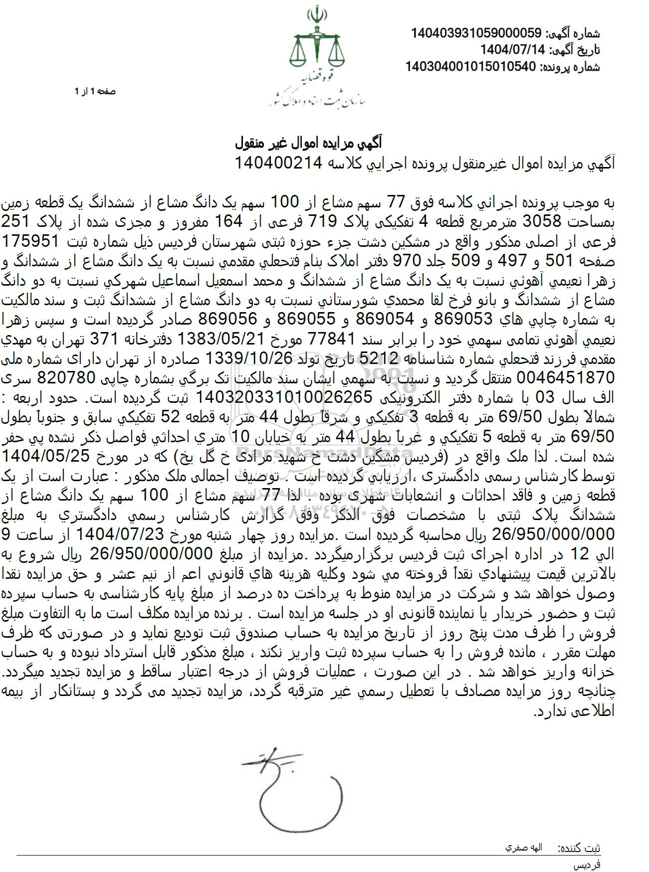 به موجب پرونده اجرائي كلاسه فوق 77 سهم مشاع از 100 سهم یک دانگ مشاع از ششدانگ یک قطعه زمین بمساحت 3058 متر مربع قطعه 4 تفکیکی پلاک 719 فرعی از 164 مفروز و مجزی شده از پلاک 251 فرعی از اصلی مذکور واقع در مشکین دشت جزء حوزه ثبتی شهرستان فردیس ذیل شماره ثبت 175951 صفحه 501 و 497 و 509 جلد 970 دفتر املاک بنام فتحعلي مقدمي نسبت به یک دانگ مشاع از ششدانگ و زهرا نعيمي آهوئي نسبت به یک دانگ مشاع از ششدانگ و محمد اسمعيل اسماعيل شهركي نسبت به دو دانگ مشاع از ششدانگ و بانو فرخ لقا محمدي شورستانی نسبت به دو دانگ مشاع از ششدانگ ثبت و سند مالکیت به شماره چاپي هاي 869053 و 869054 و 869055 و 869056 صادر گردیده است و سپس زهرا نعيمي أهوني تمامي سهمي خود را برابر سند 77841 مورخ 1383.05.21 دفترخانه 371 تهران به مهدي مقدمي فرزند فتحعلي شماره شناسنامه 5212 تاریخ تولد 1339.10.26 صادره از تهران دارای شماره ملی 0046451870 منتقل گردید و نسبت به سهمی ایشان سند مالکیت تک برگی بشماره چاپی 820780 سری الف سال 03 با شماره دفتر الکترونیکی 140320331010026265 ثبت گردیده است. حدود اربعه : شمالا بطول 69/50 متر به قطعه 3 تفكيكي و شرقا بطول 44 متر به قطعه 52 تفكيكي سابق وجنوباً بطول 69/50 متر به قطعه 5 تفكيكي و غرباً بطول 44 متر به خیابان 10 متري احداثي فواصل ذکر نشده بي حفر شده است. لذا ملک واقع در فردیس مشگین دشت خ شهید مرادی خ گل یخ که در مورخ 1404.05.25 توسط کارشناس رسمی دادگستری ارزیابی گردیده است. توصیف اجمالی ملک مذکور : عبارت است از یک قطعه زمین و فاقد احداثات و انشعابات شهری بوده . لذا 77 سهم مشاع از 100 سهم یک دانگ مشاع از ششدانگ پلاک ثبتی با مشخصات فوق الذکر وفق گزارش کارشناس رسمی دادگستری به مبلغ 26.950.000.000 ريال محاسبه گردیده است. مزایده روز چهار شنبه مورخ 1404.07.23 از ساعت 9 الي 12 در اداره اجرای ثبت فردیس برگزار میگردد. مزایده از مبلغ 26.950.000.000 ریال شروع به بالاترین قیمت پیشنهادی نقداً فروخته مي شود و كليه هزينه هاي قانوني اعم از نیم عشر و حق مزایده نقدا وصول خواهد شد و شرکت در مزایده منوط به پرداخت ده درصد از مبلغ پایه کارشناسی به حساب سپرده ثبت و حضور خریدار یا نماینده قانونی او در جلسه مزایده است. برنده مزایده مکلف است ما به التفاوت مبلغ فروش را ظرف مدت پنج روز از تاریخ مزایده به حساب صندوق ثبت تودیع نماید و در صورتی که ظرف مهلت مقرر ، مانده فروش را به حساب سپرده ثبت واریز نکند، مبلغ مذکور قابل استرداد نبوده و به حساب خزانه واریز خواهد شد. در این صورت، عملیات فروش از درجه اعتبار ساقط و مزایده تجدید میگردد. چنانچه روز مزایده مصادف با تعطیل رسمي غیر مترقبه ،گردد مزایده تجدید میگردد و بستانکار از بیمه اطلاعی ندارد.