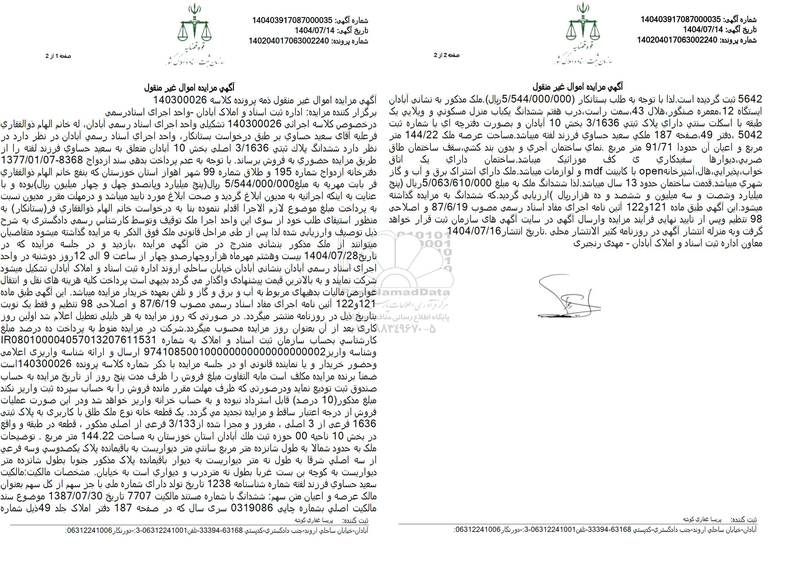 در خصوص کلاسه اجرائی 140300026 تشکیلی واحد اجرای اسناد رسمی آبادان له خاتم الهام ذو الفقاری فر علیه آقای سعید حساوی بر طبق درخواست بستانکار واحد اجرای اسناد رسمی آبادان در نظر دارد در نظر دارد ششدانگ پلاک ثبتی 3.1636 اصلی بخش 10 آبادان متعلق به سعید حساویی فرزند لفته را از طریق مزایده حضوری به فروش برساند با توجه به عدم پرداخت بدهی سند ازدواج 8368-1377.01.07 دفترخانه ازدواج شماره 195 و طلاق شماره 99 شهر اهواز استان خوزستان که بنفع خاتم الهام ذو الفقاری فر ثابت مهریه به مبلغ 5.544.000.000 ریال (پنج میلیارد و پانصد و چهل و چهار میلیون ریال بوده و با عنایت به اینکه اجرائیه به مدیون ابلاغ گردید و صحت ابلاغ مورد تایید میباشد و در مهلت مقرر مدیون نسبت به پرداخت مبلغ موضوع لازم الاجرا اقدام ننموده بنا به درخواست خانم الهام ذوالفقاری فر (بستانکار) به منظور استیفای طلب خود از سوی این واحد اجرا ملک توقیف و توسط کارشناس رسمی دادگستری به شرحذیل توصیف و ارزیابی شده لذا پس از طی مراحل قانونی ملک فوق الذکر به مزایده گذاشته میشود متقاضیان میتوانند از ملک مذکور بنشانی مندرج در متن آگهی مزایده بازدید و در جلسه مزایده که در تاریخ 1404.07.28 بیست و هشتم مهرماه هزار و چهار صد و چهار از ساعت 9 الی 12 روز دوشنبه در واحد اجرای اسناد رسمی آبادان بنشانی آبادان خیابان ساحلی اروند اداره ثبت اسناد و املاک آبادان تشکیل میشود. شرکت نمایند و به بالاترین قیمت پیشنهادی واگذار می گردد بدیهی است پرداخت کلیه هزینه های نقل و انتقال عوارض مالیات بدهیهای مربوط به آب و برق و گاز و تلفن بعهده خریدار مزایده میباشد. این آگهی طبق ماده 121 و 122 آئین نامه اجرای مفاد اسناد رسمی مصوب 87.6.19 و اصلاحی 98 تنظیم و فقط یک نوبت بتاریخ ذیل در روزنامه منتشر میگردد در صورتی که روز مزایده به هر دلیلی تعطیل اعلام شد اولین روز کاری بعد از آن بعنوان روز مزایده محسوب میگردد. شرکت در مزایده منوط به پرداخت ده درصد مبلغ کارشناسی بحساب سازمان ثبت اسناد و املاک به شماره IR080100004057013207611531 و شناسه واریز 100000000000000000002 974108500 ارسال و ارائه شناسه واریری اعلامی وحضور خریدار و با نماینده قانونی او در جلسه مزایده با ذکر شماره کلاسه پرونده 140300026 است. ضمنا برنده مزایده مکلف است مابه التفاوت مبلغ فروش را ظرف مدت پنج روز از تاریخ مزایده به حساب صندوق ثبت تودیع نماید و در صورتی که ظرف مهلت مقرر مانده فروش را به حساب سپرده ثبت واریز نکند. مبلغ مذکور (10) (درصد قابل استرداد نبوده و به حساب خزانه واریز خواهد شد و در این صورت عملیات فروش از درجه اعتبار ساقط و مزایده تجدید می گردد یک قطعه خانه نوع ملک طلق با کاربری به پلاک ثبتی 1636 فرعی از 3 اصلی، مغرور و مجزا شده از 3.133 فرعی از اصلی مذکور، قطعه در طبقه و واقع در بخش 10 ناحیه 00 حوزه ثبت ملک آبادان استان خوزستان به مساحت 144.22 متر مربع . توضیحات ملک به حدود شمالا به طول شانزده متر مربع سانتی متر دیواریست به باقیمانده پلاک یکصدوسی و سه فرعی از سه اصلی شرقا به طول نه متر دیواریست به دیوار باقیمانده پلاک مذکور جنوبا بطول شانزده متر دیواریست به کوچه بن بست غربا بطول به متر درب و دیواری است به خیابان مشخصات مالکیت مالکیت سعید حساوی فرزند لفته شماره شناسنامه 1238 تاریخ تولد دارای شماره ملی با جز سهم از کل سهم بعنوان مالک عرصه و اعیان متن سهم ششدانگ با شماره مستند مالکیت 7707 تاریخ 1387.07.30 موضوع سند مالکیت اصلی بشماره چاپی 0319086 سری سال که در صفحه 187 دفتر املاک جلد 49 ذیل شماره کف 5642 ثبت گردیده است. لذا با توجه به طلب بستانکار (5.544.000.000 ریال) . ملک مذکور به نشانی آبادان ایستگاه 12 ، معمره صنگور هلال 43 سمت راست درب هفتم ششدانگ یک باب منزل مسکونی و ویلایی یک طبقه با اسکلت سنتی دارای پلاک ثبتی 3.1636 بخش 10 آبادان و بصورت دفترچه ای با شماره ثبت 5042 ، دفتر 49 صفحه 187 ملکی سعید حساوی فرزند لفته میباشد. مساحت عرصه ملک 144.22 متر مربع و اعیان آن حدودا 91.71 متر مربع نمای ساختمان آجری و بدون بند کشی، سقف ساختما
