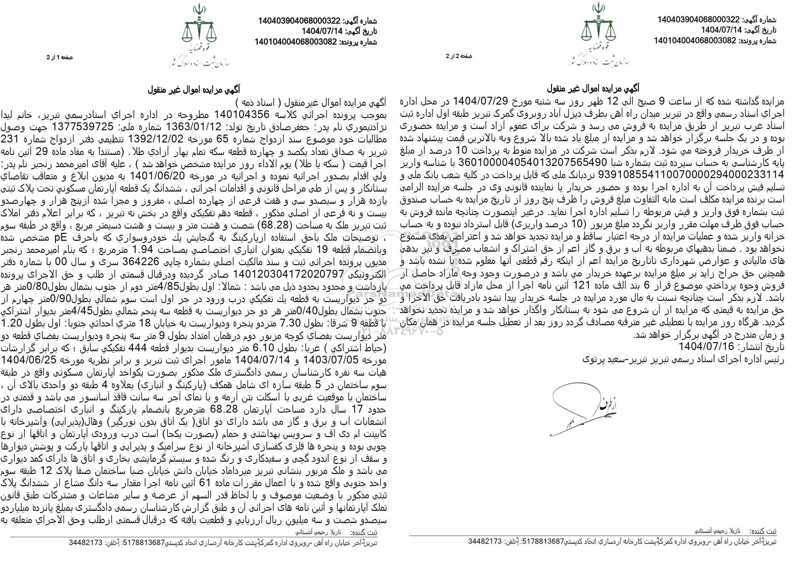 بموجب پرونده اجرائي كلاسه 140104356 مطروحه در اداره اجرای اسنادرسمي تبريز، خانم ليدا نژاد تیموری نام پدر جعفر صادق تاریخ تولد 1363.01.12 شماره ملی 1377539725 جهت وصول مطالبات خود موضوع سند ازدواج شماره 65 مورخه 1392.12.02 تنظیمی دفتر ازدواج شماره 231 تبریز به صداق تعداد یکصد و چهارده قطعه سکه تمام بهار آزادی طلا . مستنداً به مفاد ماده 29 آئین نامه اجرا قیمت ) سکه یا طلا) يوم الاداء روز مزایده مشخص خواهد شد ) ، علیه آقای امیر محمد رنجبر نام پدر ولي اقدام بصدور اجرائیه نموده و اجرائیه در مورخه 1401.06.20 به مدیون ابلاغ و متعاقب تقاضاي بستانکار و پس از طی مراحل قانونی و اقدامات اجرائی ، ششدانگ یک قطعه آپارتمان مسکونی تحت پلاک ثبتی یازده هزار و سیصد و سی و هفت فرعی از چهارده اصلی ، مفروز و مجزا شده از پنج هزار و چهار صدو بیست و نه فرعی از اصلی مذکور ، قطعه دهم تفکیکی واقع در بخش نه تبریز، که برابر اعلام دفتر املاک ثبت تبریز ملک به مساحت (68.28) شصت و هشت متر و بیست و هشت دسیمتر مربع ، واقع در طبقه سوم ، توضیحات ملک با حق استفاده از پارکینگ به گنجایش یک خودروسواري که با حرف PE مشخص شده و بانضمام قطعه 19 تفكيكي بعنوان انباري اختصاصي بمساحت 1.94 متر مربع ؛ که بنام امیر محمد رنجبر مدیون پرونده اجرائی ثبت و سند مالکیت اصلي بشماره چاپی 364226 سری و سال 00 با شماره دفتر الکترونیکی 140120304172020797 صادر گردیده و در قبال قسمتی از طلب و حق الاجرای پرونده بازداشت و محدود بحدود ذیل می باشد: شمالا اول بطول 4.85 متر دوم از جنوب بشمال بطول 0.80 متر هر دو جز دیواریست به قطعه يك تفكيكي درب ورود در جز اول است سوم شمالي بطول 0.90 متر چهارم از جنوب بشمال بطول 0.40 متر هر دو جز دیواریست به قطعه سه پنجم شمالي بطول 4.45 متر بديوار اشتراكي با قطعه 9 شرقا : بطول 7.30 متر دو پنجره و دیواریست به خیابان 18 متري احداثي جنوبا : اول بطول 1.20 متر دیواریست بفضای کوچه مزبور دوم در همان امتداد بطول 9 متر سه پنجره و دیواریست بفضاي قطعه دو حياط اشتراكي ( غربا : بطول 6.10 متر دیواریست بدیوار قطعه 444 تفكيكي سابق ؛ که برابر گزارشات 1404.06.25 مورخه 1403.07.05 و 1404.07.14 مامور اجرای ثبت تبریز و برابر نظریه مورخه هیات سه نفره کارشناسان رسمی دادگستری ملک مذکور بصورت یک واحد آپارتمان مسکونی واقع در طبقه سوم ساختمان در 5 طبقه سازه ای شامل همکف پارکینگ و انباری بعلاوه 4 طبقه دو واحدی بالای آن ، ساختمان با موقعیت غربی با اسکلت بتن آرمه و با نمای آجر سه سانت فاقد آسانسور می باشد و قدمتی در حدود 17 سال دارد مساحت آپارتمان 68.28 متر مربع بانضمام پارکینگ و انباری اختصاصی دارای انشعابات آب و برق و گاز میباشد دارای دو اتاق ) یک اتاق بدون نورگیر و هال پذیرایی و آشپزخانه با کابینت ام دی اف و سرویس بهداشتی و حمام بصورت یکجا است درب ورودی آپارتمان و اتاقها از نوع چوبی بوده و پنجره ها فلزی کفسازی آشپزخانه از نوع سرامیک و پذیرایی و اتاقها پارکت و پوشش دیوارها و سقف از نوع اندود گچی و سفیدکاری و رنگ شده و سیستم گرمایشی بخاری و اتاقها دارای کمد دیواری می باشد و ملک مزبور بنشانی تبریز میرداماد خیابان دانش خیابان صبا ساختمان صفا پلاک 12 طبقه سوم واحد جنوبی واقع شده و با اعمال مقررات ماده 61 آئین نامه اجرا مقدار سه دانگ مشاع از ششدانگ پلاک ثبتی مذکور با وضعیت موصوف و با لحاظ قدر السهم از عرصه و سایر مشاعات و مشترکات طبق قانون تملک آپارتمانها و آئین نامه های اجرائی آن و طبق گزارش کارشناسان رسمی دادگستری بمبلغ پانزده میلیاردو سیصدو شصت و سه میلیون ریال ارزيابي و قطعیت یافته که در قبال قسمتی از طلب وحق الاجراي متعلقه به مزایده گذاشته شده که از ساعت 9 صبح الی 12 ظهر روز سه شنبه مورخ 1404.07.29 در محل اداره اجراي اسناد رسمی واقع در تبریز میدان راه آهن بطرف دیزل آباد روبروی گمرک تبریز طبقه اول اداره ثبت اسناد غرب تبریز از طریق مزایده به فروش میرسد و شرکت برای عموم آزاد است و مزایده حضوری بوده و در یک جلسه برگزار خواهد شد و مزایده از مبلغ یاد شده بالا شرو