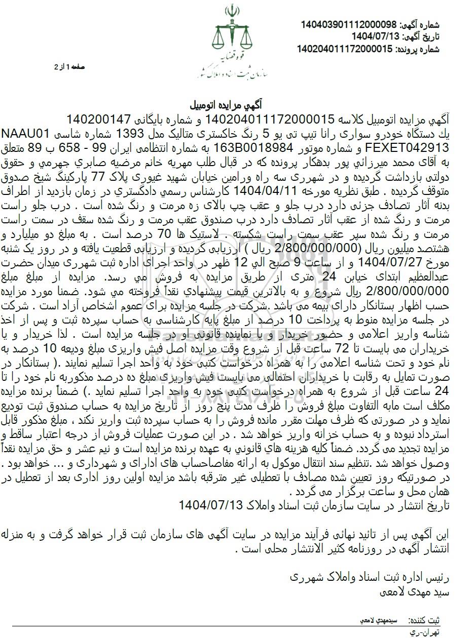 یک دستگاه خودرو سواری رانا تیپ تی یو 5 رنگ خاکستری متالیک مدل 1393 شماره شاسی NAAU01 163 FEXET042913 و شماره موتور 163B0018984 به شماره انتظامی ایران 99 - 658 ب 89 متعلق به آقای محمد میرزائی پور بدهکار پرونده که در قبال طلب مهریه خانم مرضیه صابری جهرمی و حقوق دولتی بازداشت گردیده و در شهرری سه راه و رامین خیابان شهید غیوری پلاک 77 پارکینگ شیخ صدوق متوقف گردیده . طبق نظریه مورخه 1404.04.11 کارشناس رسمی دادگستری در زمان بازدید از اطراف بدنه آثار تصادف جزئی دارد درب جلو و عقب چپ بالای زه مرمت و رنگ شده است. درب جلو راست مرمت و رنگ شده از عقب آثار تصادف دارد درب صندوق عقب مرمت و رنگ شده سقف در سمت راست مرمت و رنگ شده سپر عقب سمت راست شکسته. لاستیک ها 70 درصد است. به مبلغ دو میلیارد و هشتصد میلیون ریال (2.800.000.000 ریال) ارزیابی گردیده و ارزیابی قطعیت یافته و در روز یک شنبه مورخ 1404.07.27 و از ساعت 9 صبح الی 12 ظهر در واحد اجرای اداره ثبت شهرری میدان حضرت عبد العظیم ابتدای خیابن 24 متری از طریق مزایده به فروش می رسد. مزایده از مبلغ مبلغ 2.800.000.000 ریال شروع و به بالاترین قیمت پیشنهادی نقداً فروخته می شود. ضمنا مورد مزایده حسب اظهار بستانکار دارای بیمه میباشد شرکت در جلسه مزایده برای عموم اشخاص آزاد است . شرکت در جلسه مزایده منوط به پرداخت 10 درصد از مبلغ پایه کارشناسی به حساب سپرده ثبت و پس از اخذ شناسه واریز اعلامی و حضور خریدار و یا نماینده قانونی او در جلسه مزایده است . لذا خریدار و یا خریداران می بایست تا 72 ساعت قبل از شروع وقت مزایده اصل فیش واریزی مبلغ ودیعه 10 درصد به نام خود و تحت شناسه اعلامی را به همراه درخواست کتبی خود به واحد اجرا تسلیم نمایند . بستانکار در صورت تمایل به رقابت با خریداران احتمالی می بایست فیش واریزی مبلغ ده درصد درصد مذکور به نام خود را تا 24 ساعت قبل از شروع به همراه درخواست کتبی خود به واحد اجرا تسلیم نماید . ضمناً برنده مزایده مکلف است ما به التفاوت مبلغ فروش را ظرف مدت پنج روز از تاریخ مزایده به حساب صندوق ثبت تودیع نماید و در صورتی که ظرف مهلت مقرر مانده فروش را به حساب سپرده ثبت واریز نکند ، مبلغ مذکور قابل استرداد نبوده و به حساب خزانه واریز خواهد شد. در این صورت عملیات فروش از درجه اعتبار ساقط و مزایده تجدید میگردد ضمنا کلیه هزینه های قانونی به عهده برنده مزایده است و نیم عشر و حق مزایده نقداً وصول خواهد شد . تنظیم سند انتقال موکول به ارائه مفاصا حسابهای ادارای و شهرداری و خواهد بود . در صورتیکه روز تعیین شده مصادف با تعطیلی غیر مترقبه باشد مزایده اولین روز اداری بعد از تعطیل در همان محل و ساعت برگزار میگردد.