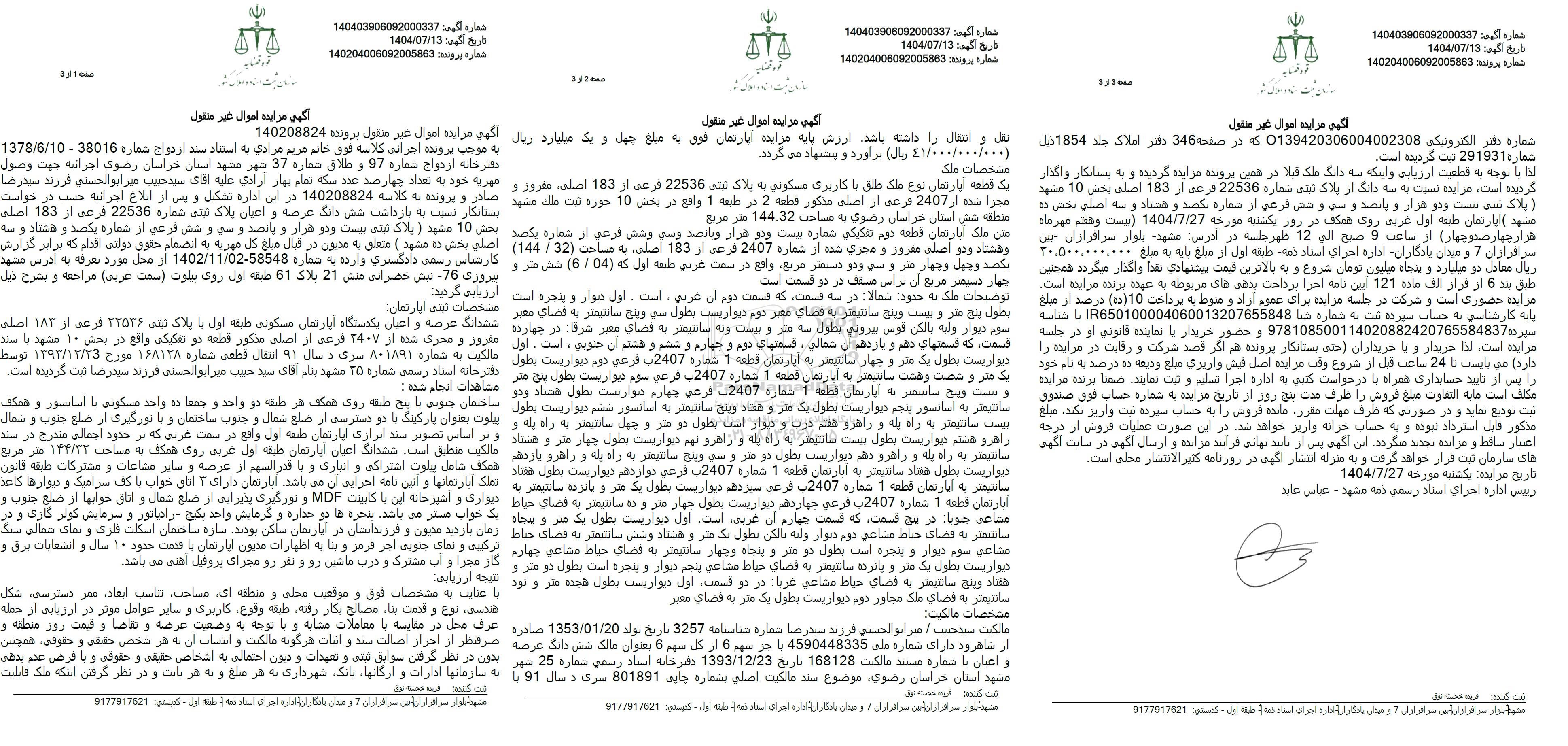 مزایده فروش ششدانگ عرصه و اعیان یکدستگاه اپارتمان مسکونی طبقه اول با پلاک ثبتی 22536 فرعی از 183 اصلی مفروز و مجزی شده از 2407 فرعی از اصلی مذکور قطعه دو تفکیکی واقع در بخش 10 مشهد به مساحت 144.33 مترمربع همکف به مبلغ 20.500.000.000 ریال