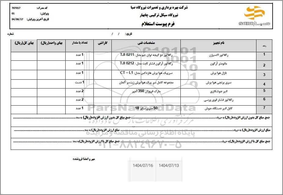 استعلام بها و موضوع استعلام استعلام رگلاتور اکسیژن و ... به اطلاع کلیه شرکت‌ها و افراد متخصص واجد شرایط می‌رساند، آگهی گذار در نظر دارد از طریق استعلام بها، نسبت به انتخاب و دریافت پیشنهادات اقدام نماید. این استعلام با کد آگهی ثبت شده در سامانه خبرگزاری پارس نماد : 9656279 منتشر شده است. مشخصات استعلام : تاریخ شروع استعلام: 1404/07/14 آخرین مهلت ارسال پیشنهاد قیمت : 1404/07/16 و محل اجرای پروژه : استان سیستان و بلوچستان میباشد. استعلام قیمت مورد درخواست : استعلام رگلاتور اکسیژن و ... با دسته‌بندی‌های تخصصی و گروه های مرتبط : ابزار دقیق, ابزار و یراق آلات, سیم و کابل, دستگاه جوش و برش, قطعات مس و برنج, نیروگاه, تجهیزات و ماشین آلات صنعتی, تجهیزات برق و الکترونیک, استعلام اطلاع رسانی میگردد.