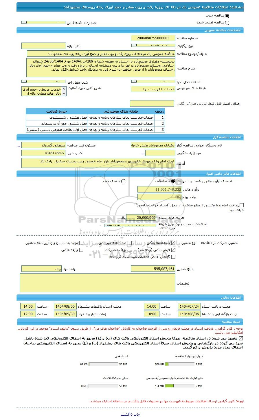| شرح مناقصه | بدينوسيله دهیاری محمودآباد به استناد به مصوبه شماره 289/ش/1404 مورخ 24/06/1404 شوراي اسلامي روستای محمودآباد در نظر دارد پيرو دعوتنامه ارسالی، پروژه رفت و روب معابر و جمع آوری زباله روستای محمودآباد را از طریق مناقصه به شرح ذیل به پیمانکار واجد شرایط واگذار نماید. | ||||||||||||||