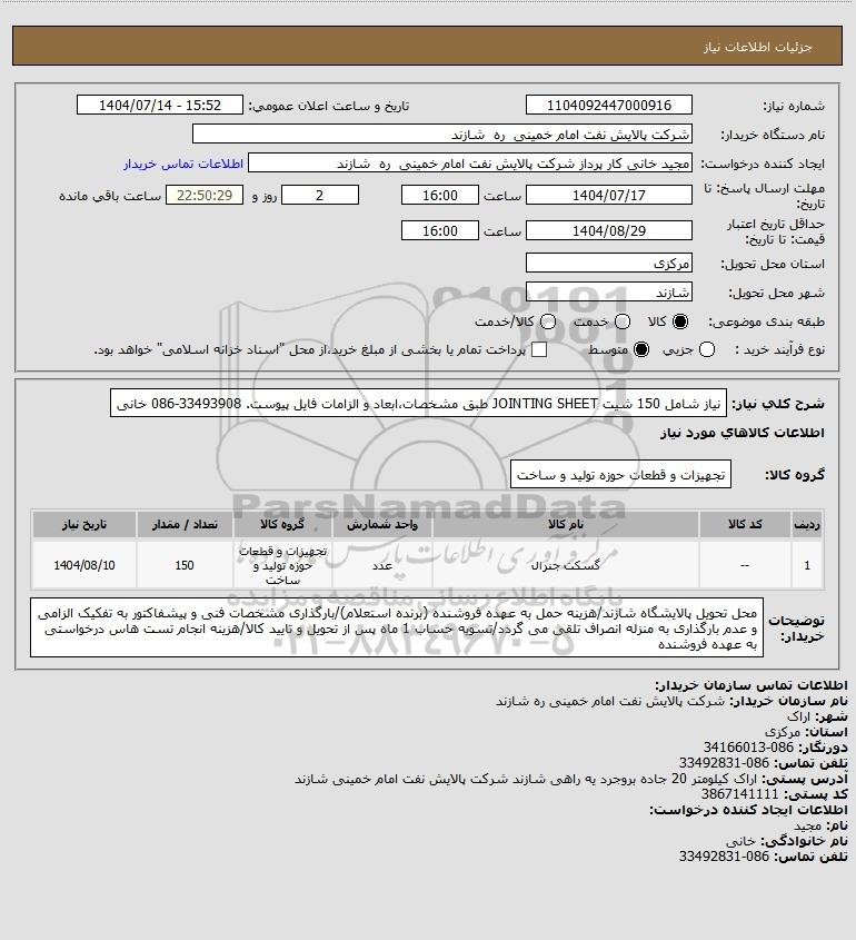 شرح کلی نیاز: نیاز شامل 150 شیت JOINTING SHEET طبق مشخصات،ابعاد و الزامات فایل پیوست. 33493908-086 خانی