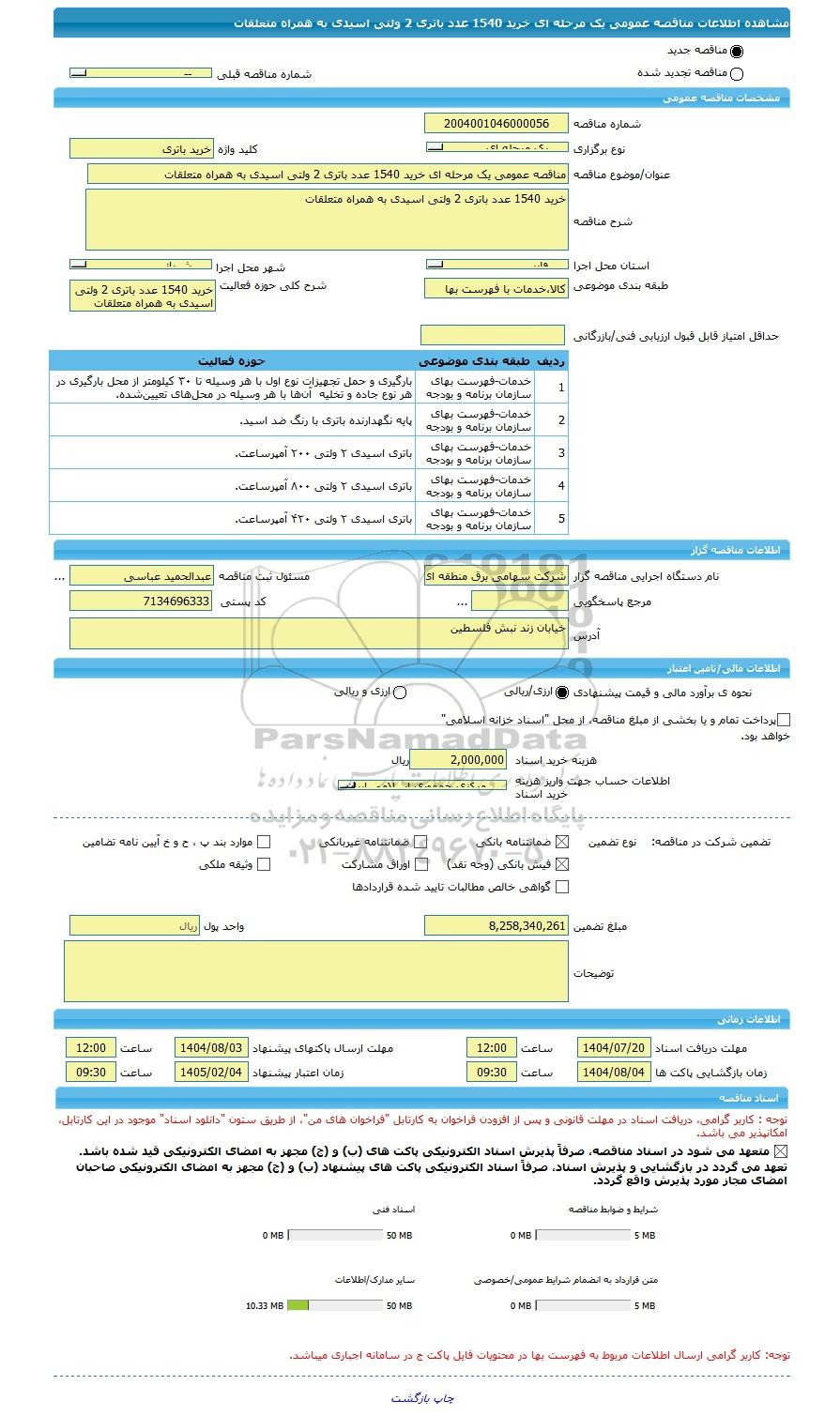 مناقصه مناقصه عمومی یک مرحله ای خرید 1540 عدد باتری 2 ولتی اسیدی به همراه متعلقات از کلیه افراد متخصص و شرکتها واجد شرایط دعوت به عمل میآید در مناقصه با کد خبرگزاری پارس نماد: 9656469 شرکت نمایند.