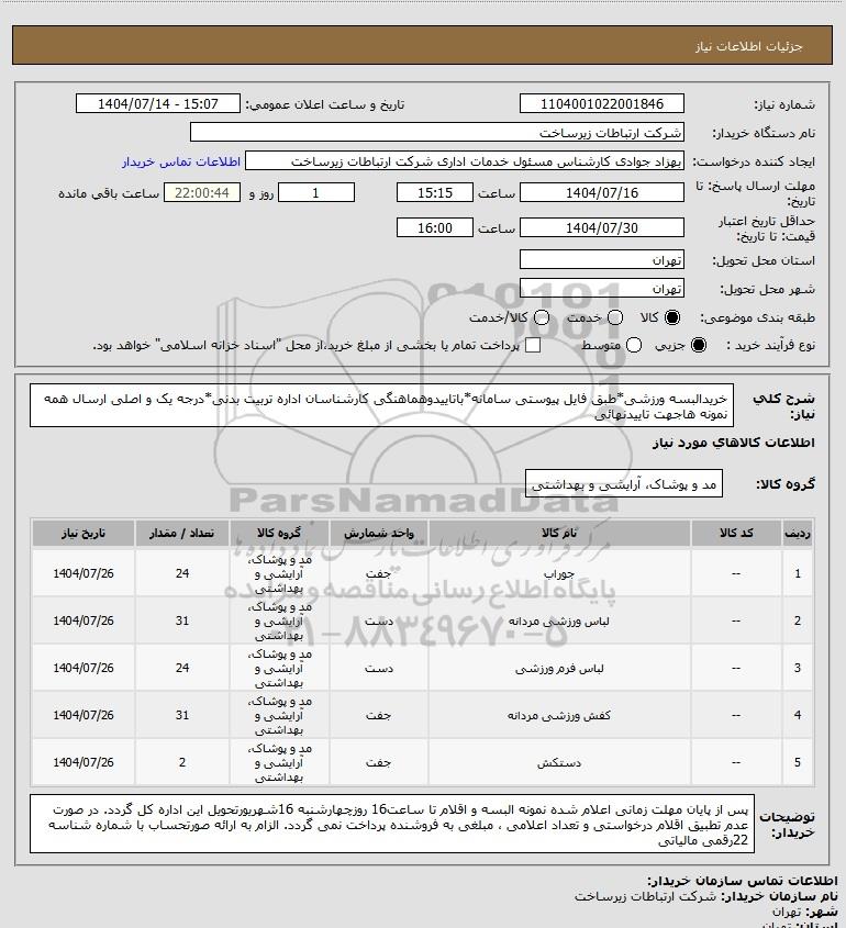 شرح کلی نیاز: خریدالبسه ورزشی*طبق فایل پیوستی سامانه*باتاییدوهماهنگی کارشناسان اداره تربیت بدنی*درجه یک و اصلی
