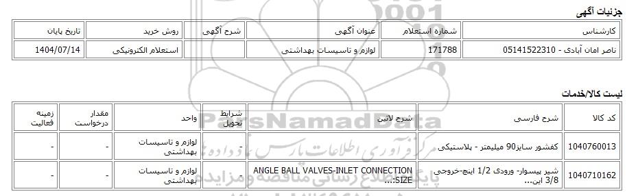 ناصر امان آبادی - 05141522310 | 171788 | لوازم و تاسیسات بهداشتی | استعلام الکترونیکی | 1404/07/14 |