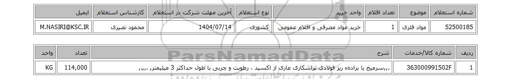 52500185مواد فلزی1خرید مواد مصرفی و اقلام عمومیکشوری1404/07/14محمود نصیریM.NASIRI@KSC.IR