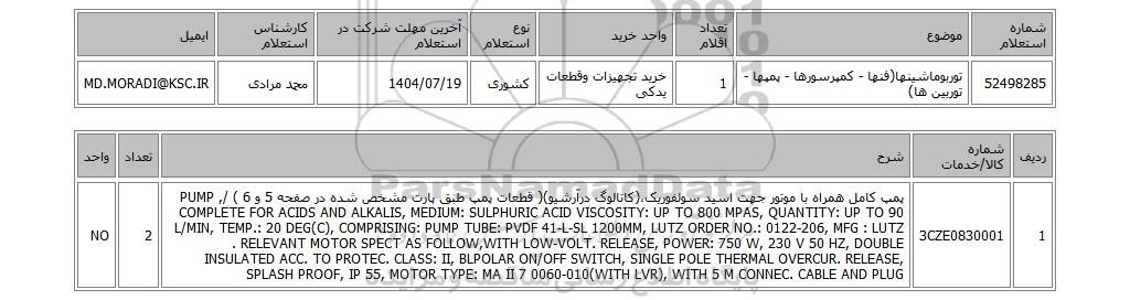 52498285 | توربوماشینها(فنها - کمپرسورها - پمپها - توربین ها) | 1 | خرید تجهیزات وقطعات یدکی | کشوری | 1404/07/19 | محمد مرادی | MD.MORADI@KSC.IR |