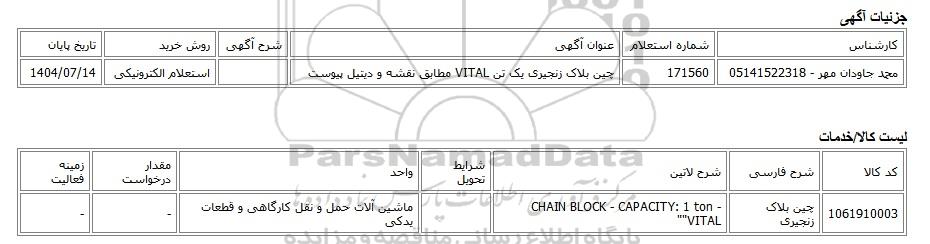 محمد جاودان مهر - 05141522318171560چین بلاک زنجیری یک تن VITAL مطابق نقشه و دیتیل پیوستاستعلام الکترونیکی1404/07/14