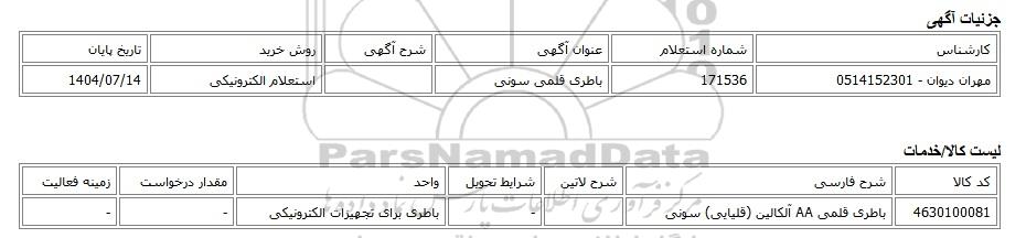 مهران دیوان - 0514152301171536باطری قلمی سونیاستعلام الکترونیکی1404/07/14