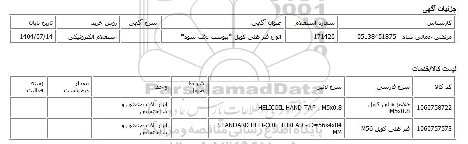 مرتضی جمالی شاد - 05138451875 | 171420 | انواع فنر هلی کویل *پیوست دقت شود* | استعلام الکترونیکی | 1404/07/14 |