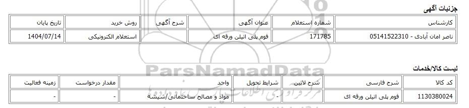 ناصر امان آبادی - 05141522310 | 171785 | فوم پلی اتیلن ورقه ای | استعلام الکترونیکی | 1404/07/14 |