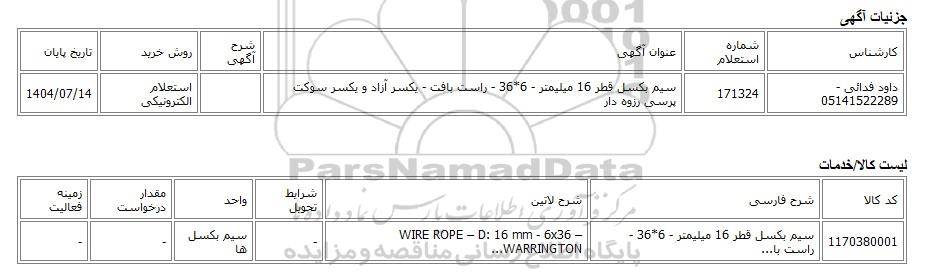 داود فدائی - 05141522289171324سیم بکسل قطر 16 میلیمتر - 6*36 - راست بافت - یکسر آزاد و یکسر سوکت پرسی رزوه داراستعلام الکترونیکی1404/07/14