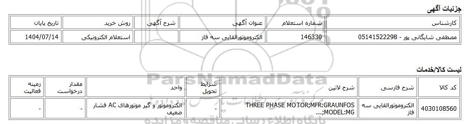 مصطفی شایگانی پور - 05141522298 | 146330 | الکتروموتورالقایی سه فاز | استعلام الکترونیکی | 1404/07/14 |