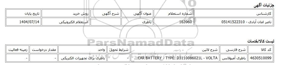 ناصر امان آبادی - 05141522310 | 163960 | باطری | استعلام الکترونیکی | 1404/07/14 |